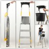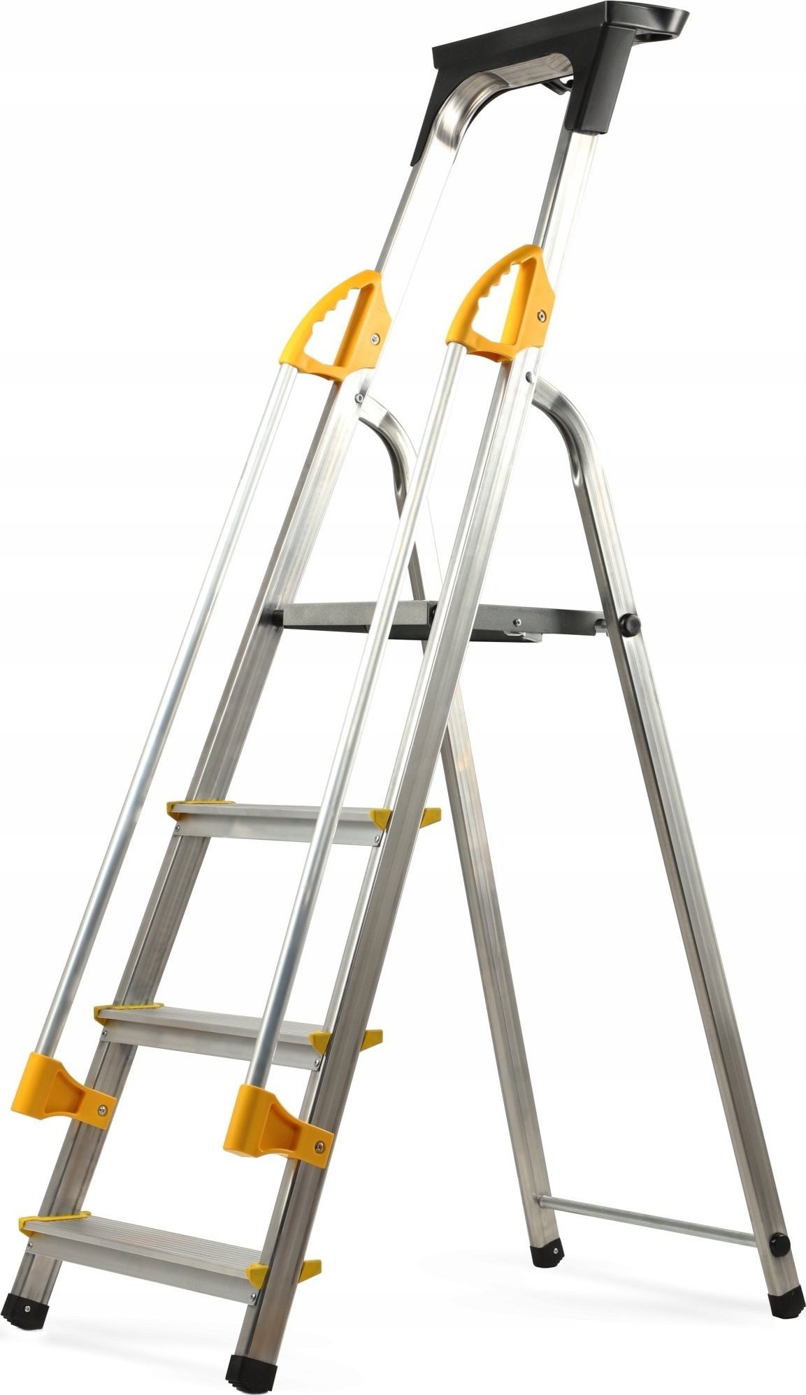Darüber hinaus verfügt die Haushaltsleiter über ergonomische Handläufe, die das Auf- und Absteigen erleichtern. Außerdem gibt es einen 60 cm hohen Bügel mit Ablage, der vor Stürzen schützt.