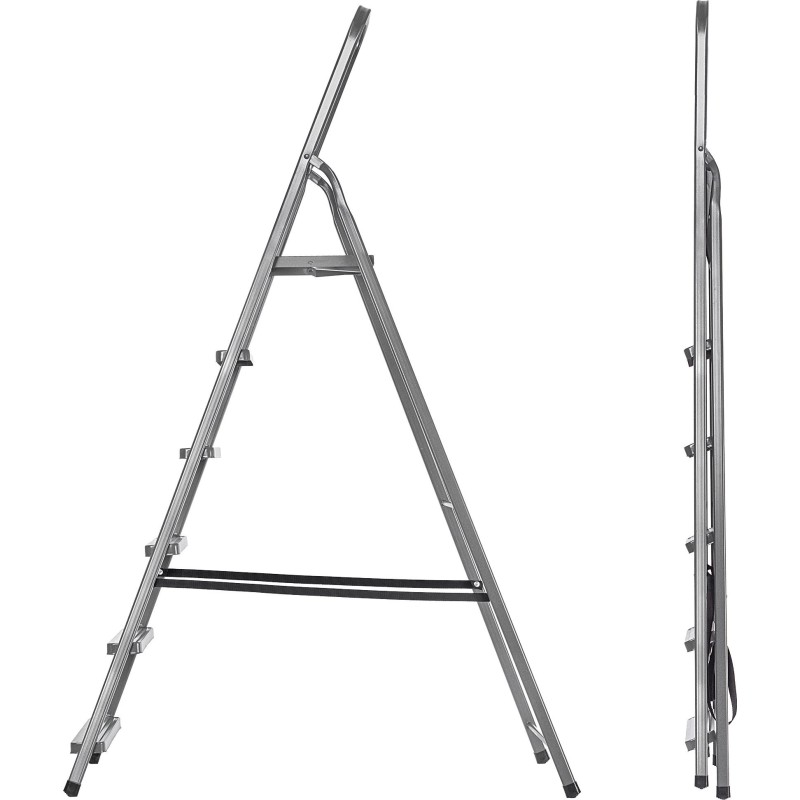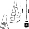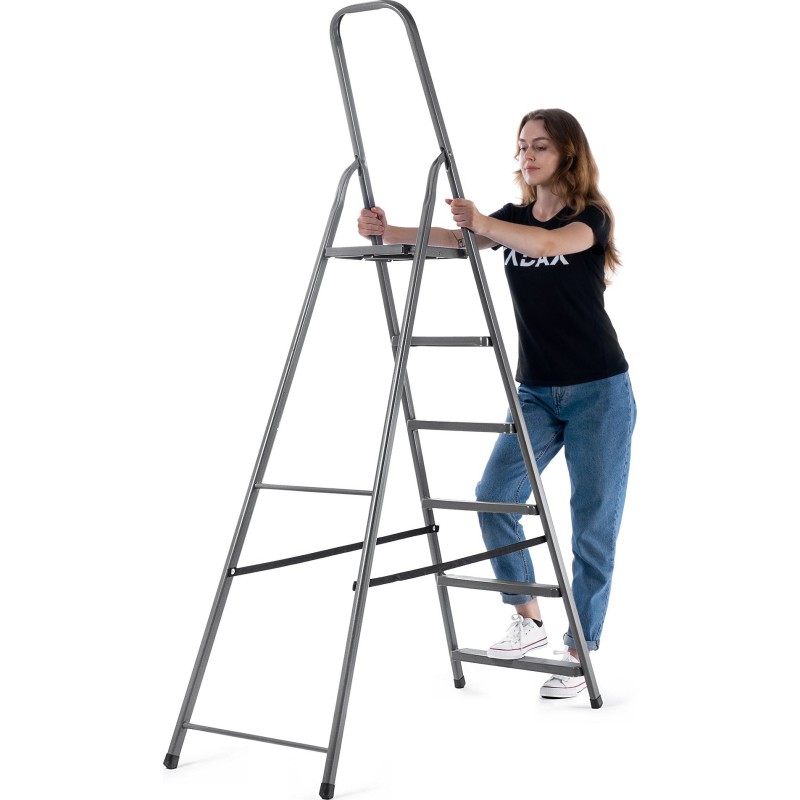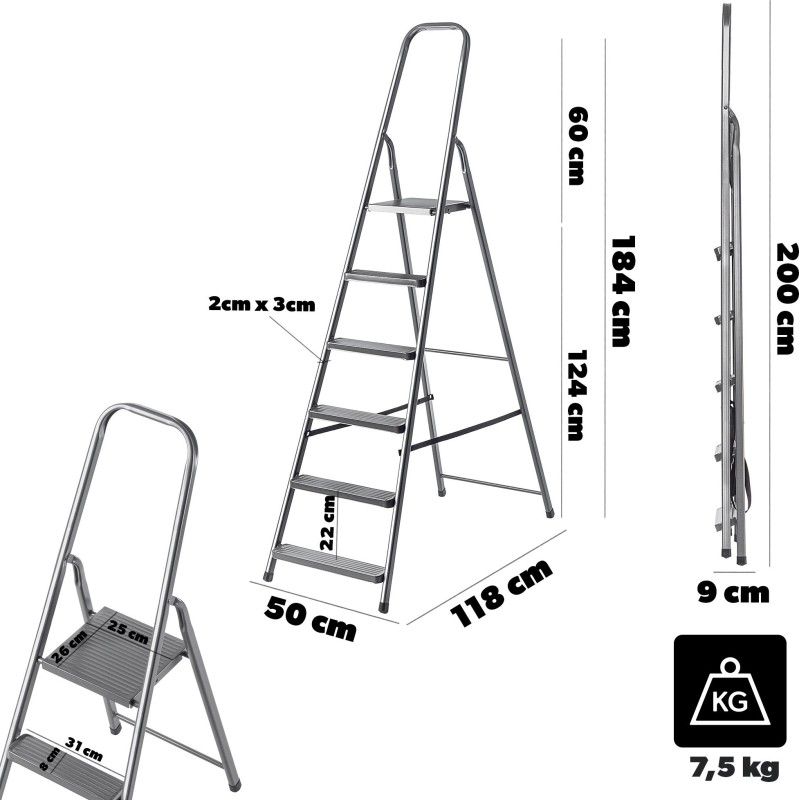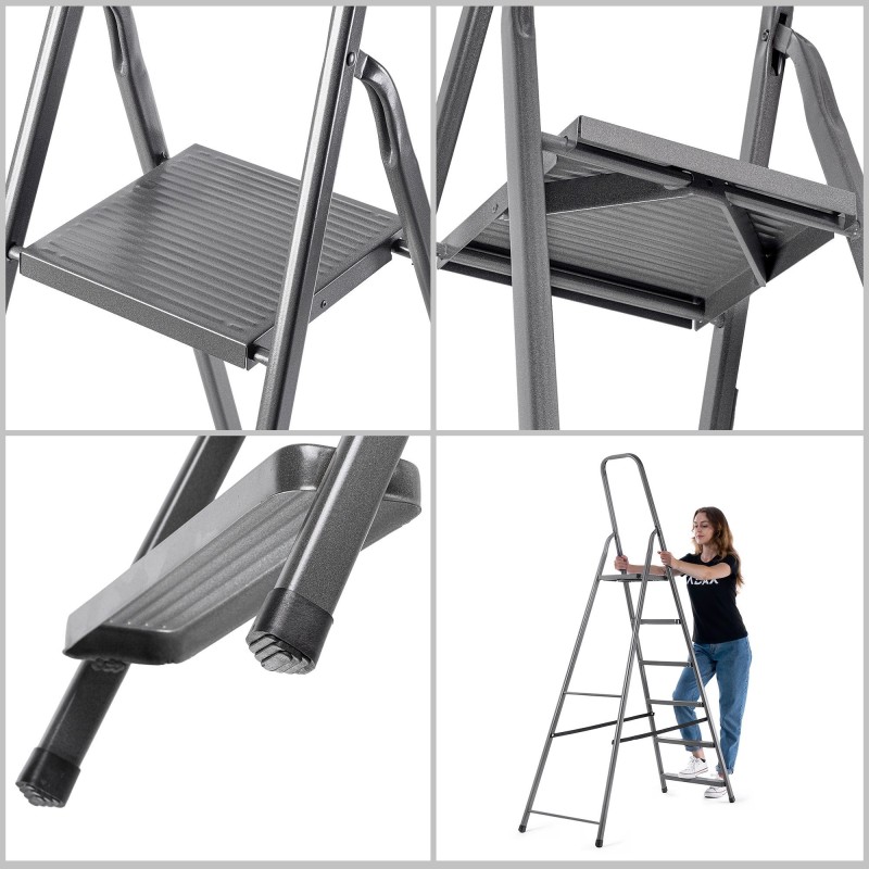 Dank der Auswahl zwischen 3-, 4-, 5- und 6-stufigen Modellen ist die Stahlleiter in der Lage, vielfältigen Anforderungen gerecht zu werden. Egal, ob Sie ein stabiles Hilfsmittel für Renovierungsarbeiten oder ein unverzichtbares Werkzeug für alltägliche Hausarbeiten benötigen, diese Leiter ist die ideale Wahl. Ihre maximale Tragkraft beträgt 125 kg, was für die meisten privaten und professionellen Anwendungen ausreichend ist. Dank der universellen, grauen Farbe und dem ansprechenden Design fügt sich die Leiter hervorragend in jede Umgebung ein, und ihre solide Konstruktion garantiert eine lange Lebensdauer und hohe Belastbarkeit.