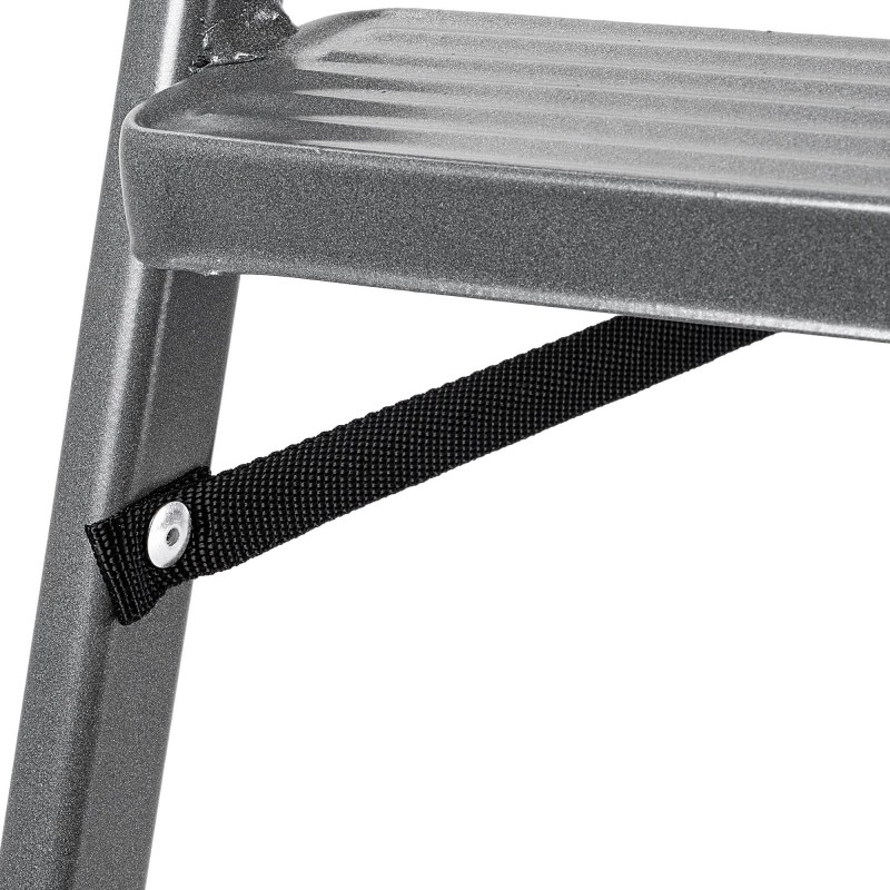 Komfort und Sicherheit bei der Nutzung – breite, geriffelte Stufen sorgen für Komfort und verhindern ein Abrutschen, während ein zusätzlicher Haltegriff auf der oberen Plattform den Komfort bei der Arbeit erhöht. Kunststofffüße erhöhen die Stabilität und verhindern ein Verrutschen der Leiter.