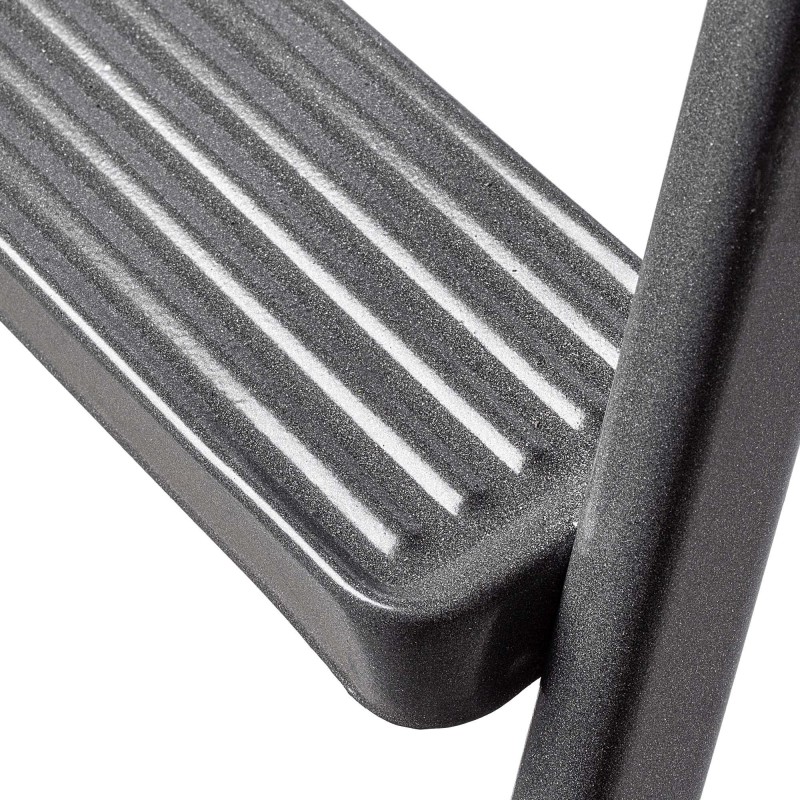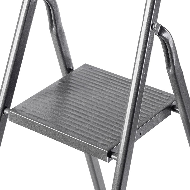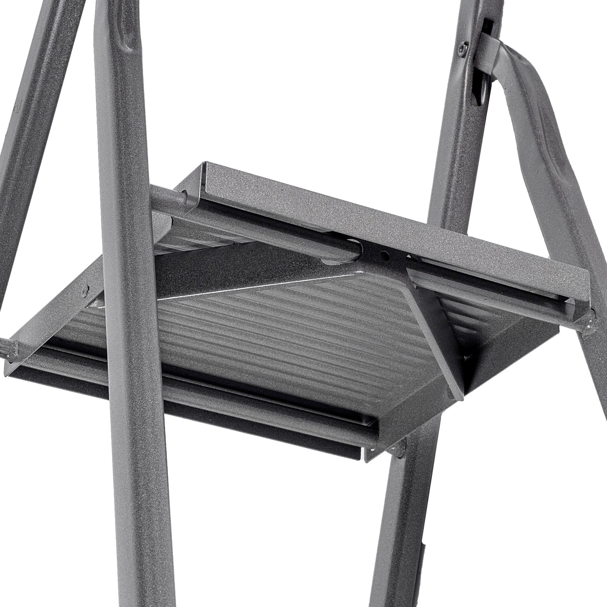 Die Leiter besteht aus hochwertigem, pulverbeschichtetem Stahl, was eine hohe Widerstandsfähigkeit gegen Stöße, Absplitterungen und andere mechanische Beschädigungen garantiert. Ideal für den intensiven Gebrauch sowohl zu Hause als auch am Arbeitsplatz.