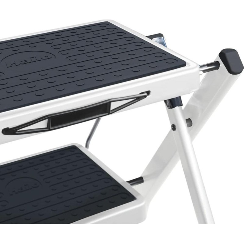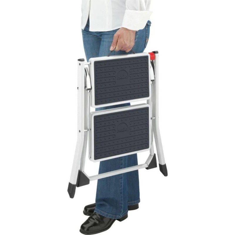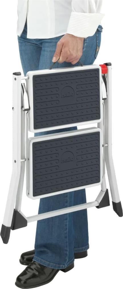 Die kleine und kompakte Leiter verfügt über 2 große Stufen mit rutschfesten Matten und passt in jede Ecke. Sie verfügt über eine Scharnierarretierung mit Entriegelungsknopf. Rutschfeste Kunststofffüße sorgen für Stabilität. Die Leiter lässt sich auf eine Dicke von nur 4 cm zusammenklappen, was die Aufbewahrung erleichtert, wenn sie nicht gebraucht wird. Dank des praktischen Tragegriffs lässt sie sich zudem sehr bequem transportieren.