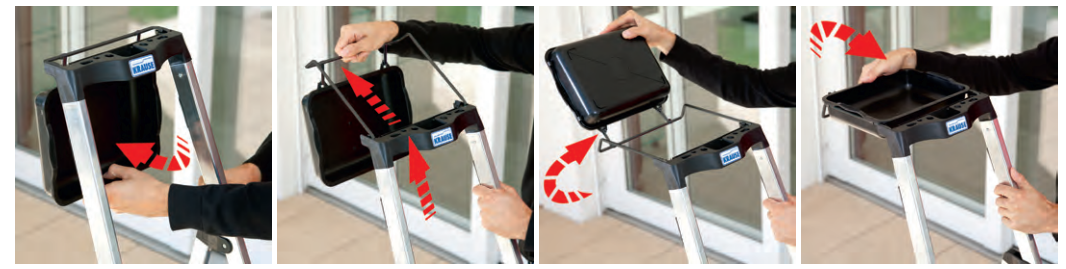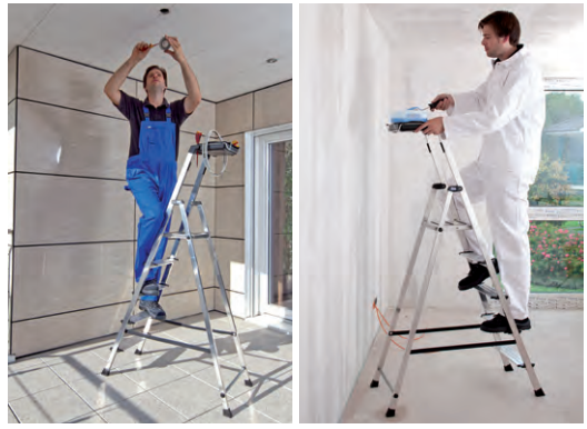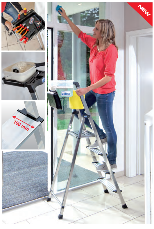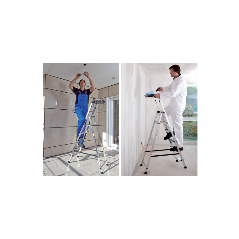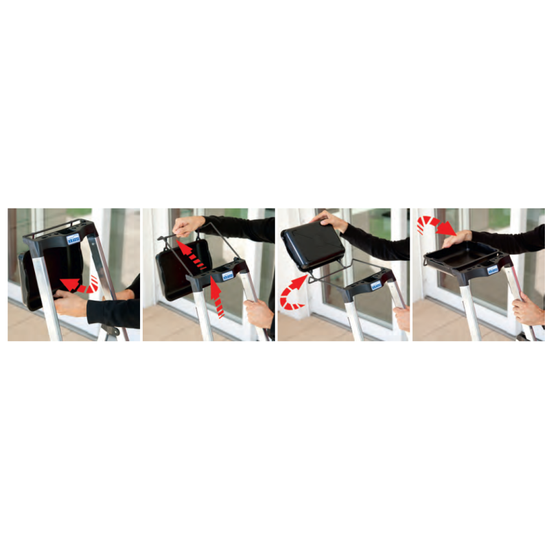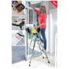 • Kompakte Aluminiumleiter mit großem, ausklappbarem Behälter, der das wiederholte Auf- und Absteigen während der Arbeit reduziert.