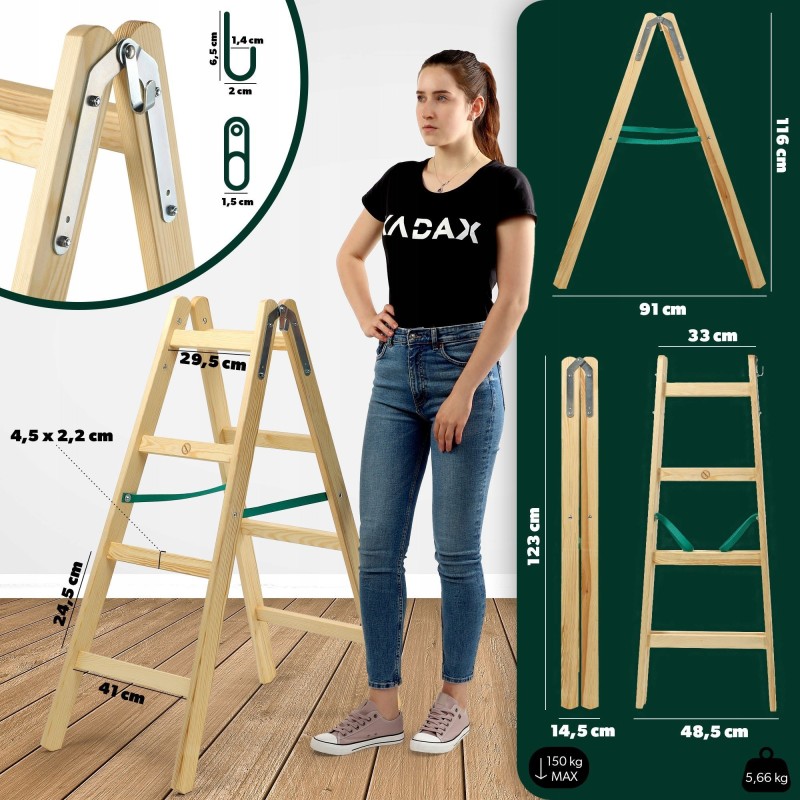 Die Holzleiter mit einer Tragkraft von 150 kg lässt sich leicht zusammen- und auseinanderklappen. Dadurch wirst du keine Probleme bei der Benutzung haben.