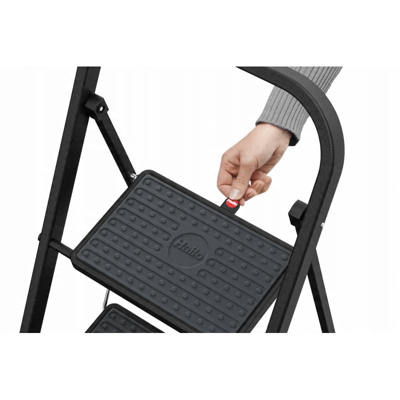 Der komfortable Griff der Hailo K44 erhöht die Stabilität während des Gebrauchs und ermöglicht so die sichere Ausführung von Arbeiten in der Höhe. Zusätzlich sorgt eine Sicherheitsverriegelung für zusätzlichen Halt.