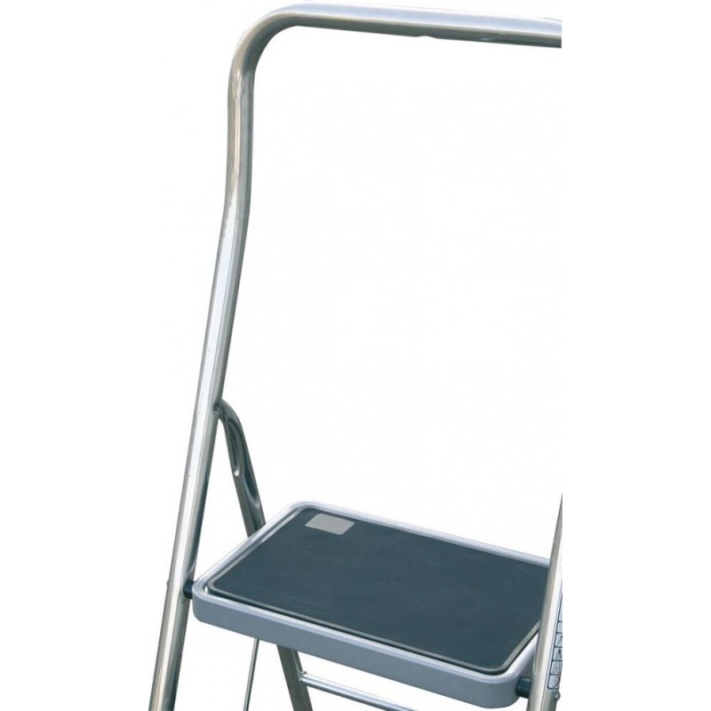 Aluminium-Klappleiter mit großen Stufen für vielfältige Arbeiten im Innenbereich, die im zusammengeklappten Zustand sehr wenig Platz beansprcht. Der hohe Handlauf erhöht die Sicherheit (600 mm). Sicherung gegen unbeabsichtigtes Zusammenklappen der Leiter während des Gebrauchs. Große, gummierte, rutschfeste Stufen sorgen für Sicherheit bei der Arbeit.