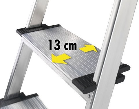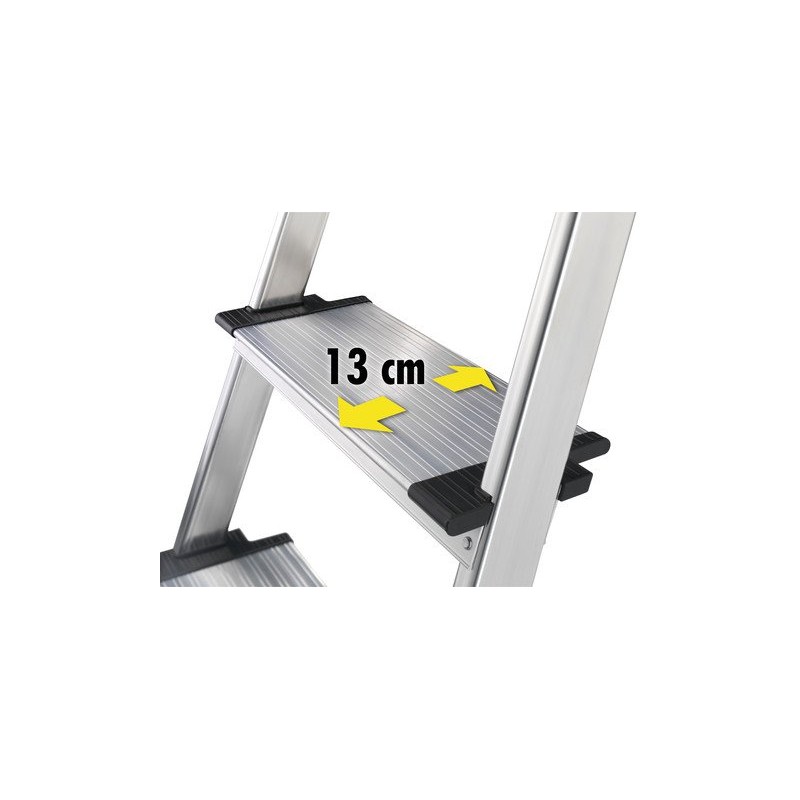 Die Leiter ist mit 13 cm breiten Aluminiumstufen ausgestattet, die für Stabilität und Sicherheit beim Gebrauch sorgen. Die rutschfeste Oberfläche der Stufen erhöht die Sicherheit zusätzlich und macht sie zur idealen Wahl für alle Arbeiten im Haushalt.