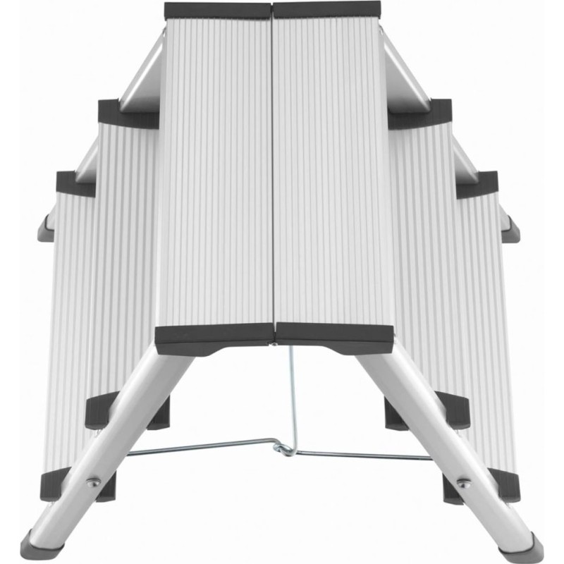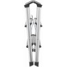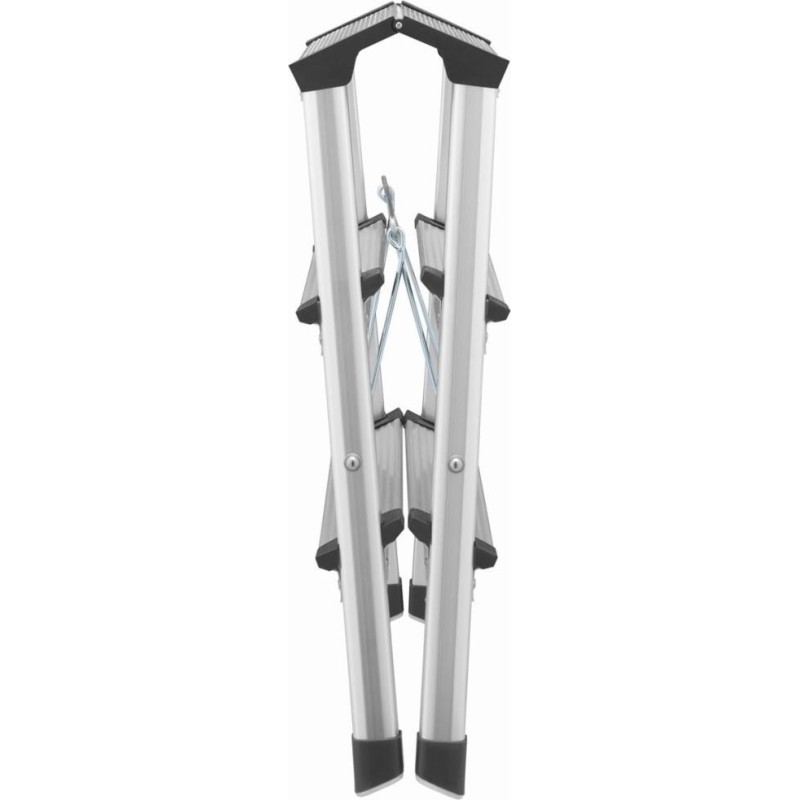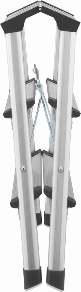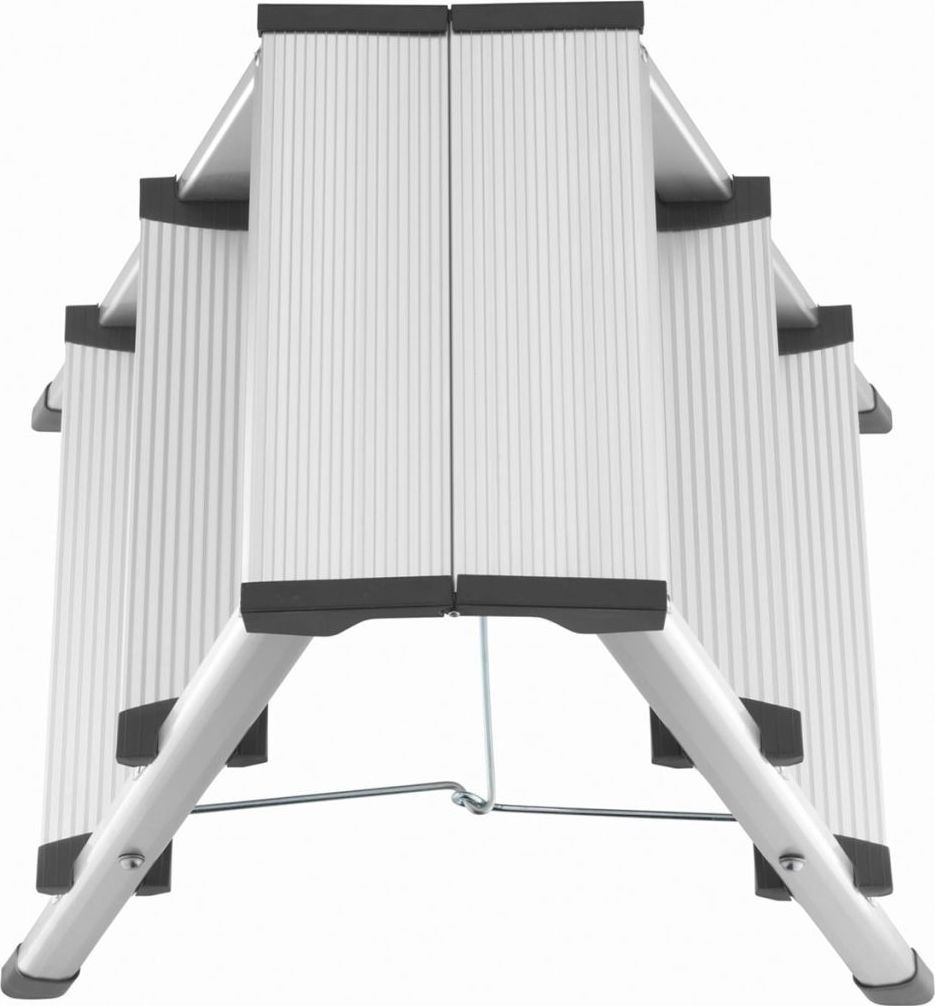 Die Leiter verfügt über einen Verriegelungsmechanismus, der ein versehentliches Zusammenklappen verhindert, sowie über Stufen auf beiden Seiten. Zusammengeklappt hat die Leiter kompakte Abmessungen, sodass Sie sie nach dem Gebrauch unter den Tisch schieben oder in eine Ecke stellen können. Ihre maximale Tragkraft beträgt 150 kg und die maximale Arbeitshöhe 235 cm.