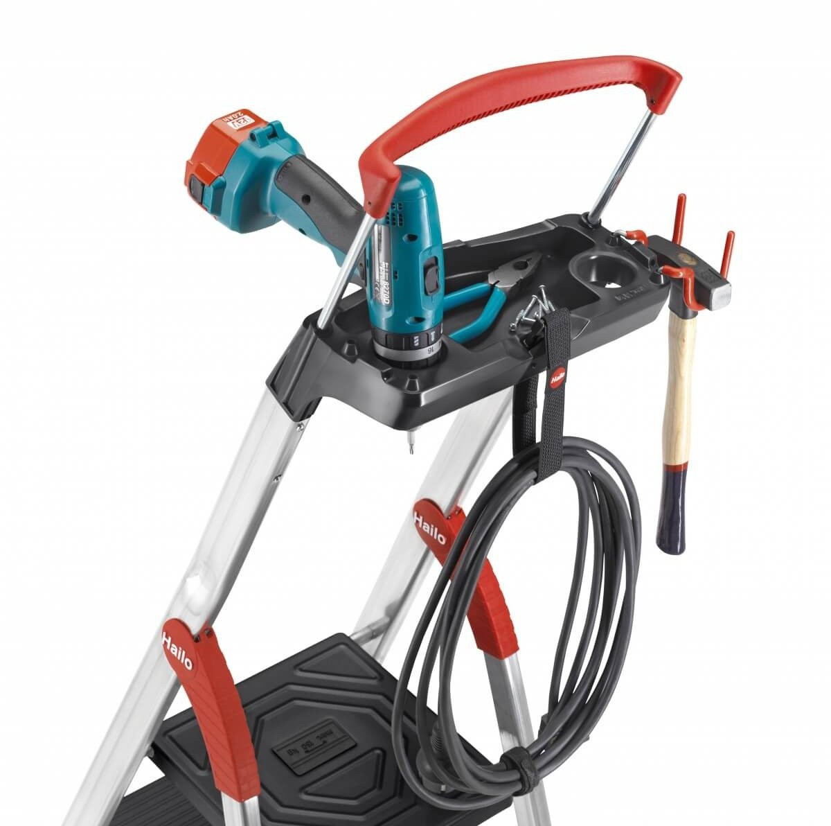 Die integrierte Eimer- und Stangenhalterung macht die Hailo-Leiter äußerst funktional. Sie ermöglicht die einfache Aufbewahrung von Werkzeugen und Materialien, was die Arbeit erheblich erleichtert und die Effizienz steigert.
