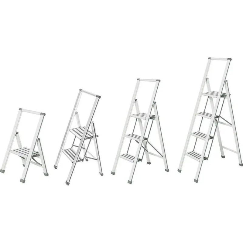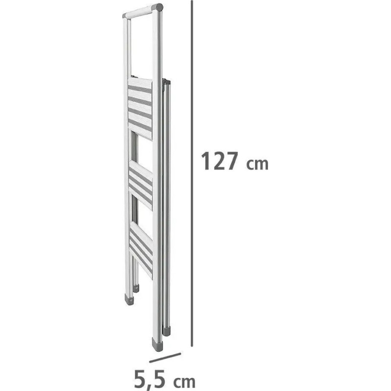 Die 3-stufige Leiter eignet sich zum Erreichen von Gegenständen auf hohen Regalen, zum Fensterputzen oder bei Renovierungsarbeiten. Ideal für Haus, Garage, Werkstatt oder Keller. Stabile und zugleich leichte Aluminiumkonstruktion. Rostfrei. Ausgestattet mit großen, rutschfesten Stufen mit Gummibeschichtung. Nimmt zusammengeklappt wenig Platz ein. Gewicht 6 kg. Maße der Leiter im zusammengeklappten Zustand: B: 44 cm x H: 131 cm x T: 6 cm.