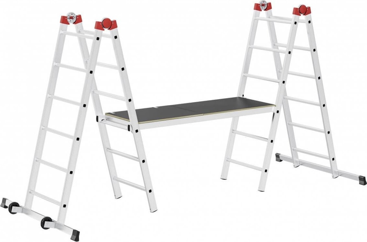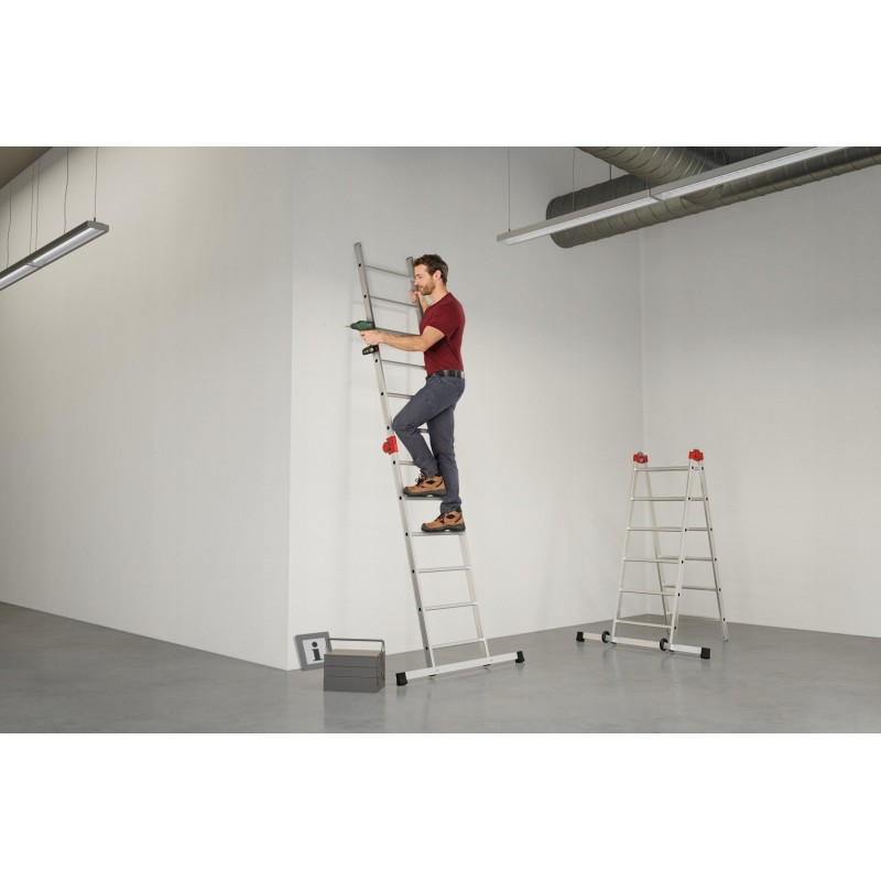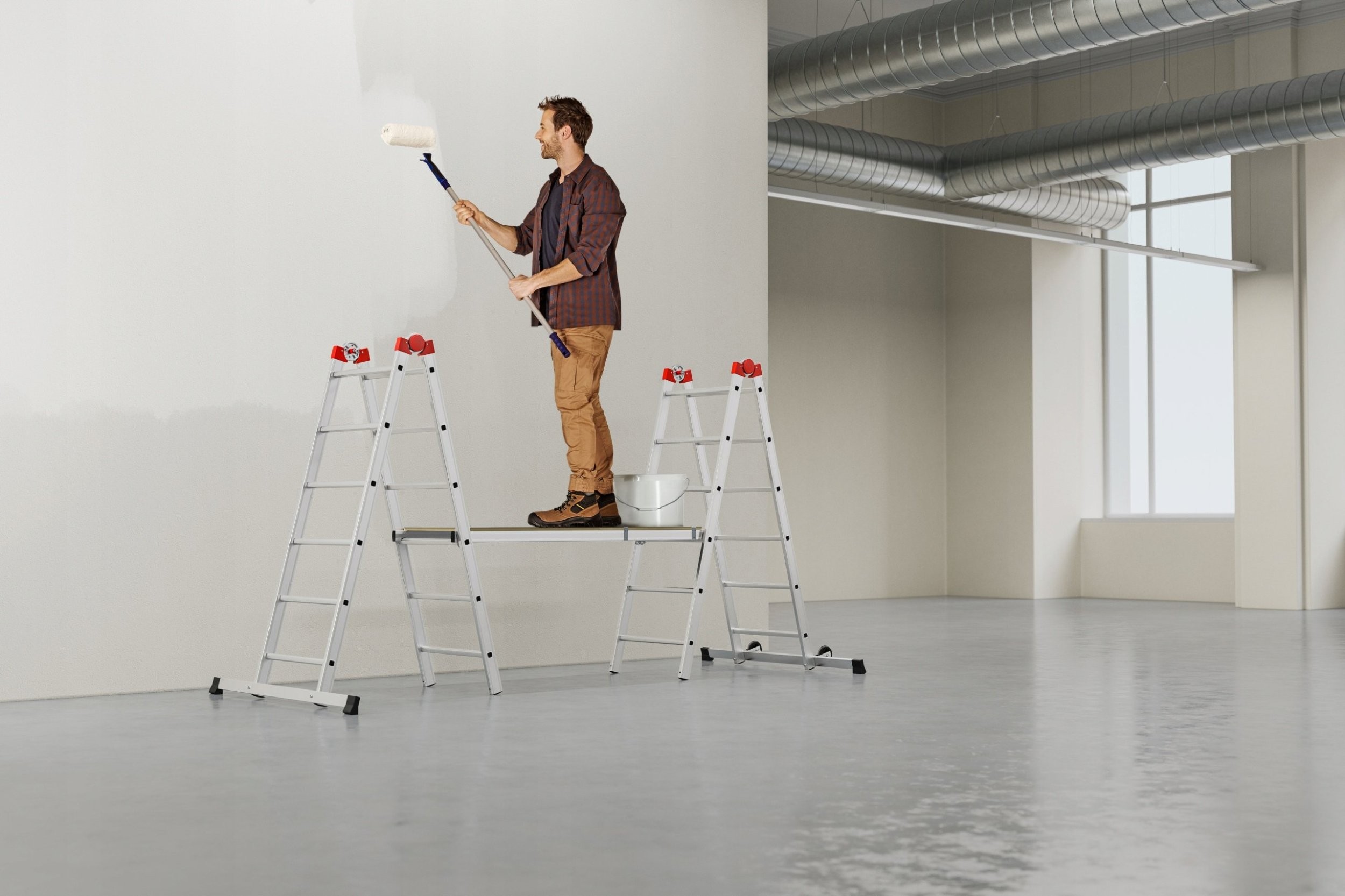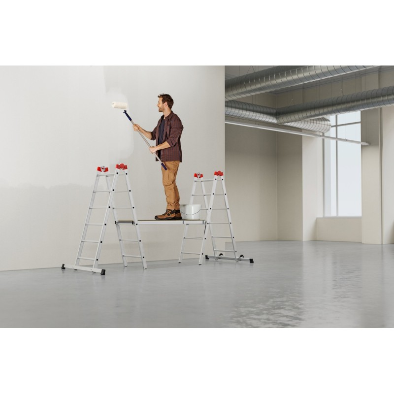 • Multifunktionalität: Einsatz als Einzel- und Doppelleiter, als kleines Gerüst für den Innen- und Außenbereich oder als Arbeitsbühne