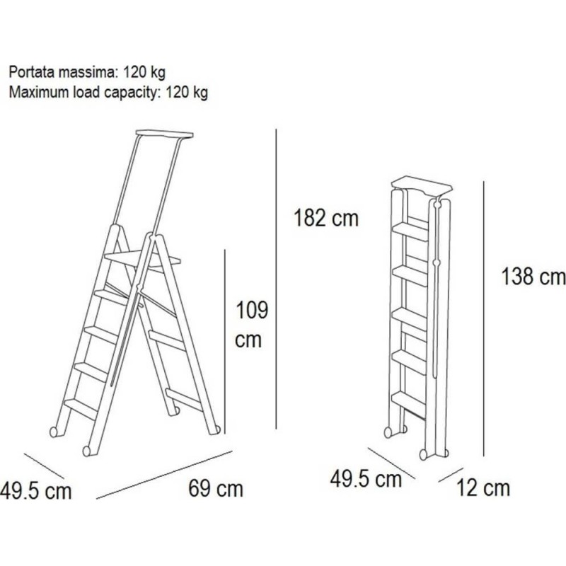 Dank ihrer 5 rutschfesten Stufen sorgt sie für Sicherheit bei anspruchsvollen Arbeiten im Haushalt. Die breite Plattform ermöglicht es, auch über längere Zeit sicher auf der Leiter zu stehen, was sie ideal für Arbeiten wie Streichen oder das Aufhängen von Vorhängen macht. Die TUSCANIA 5 verfügt über eine Stütze, die über die Plattform hinausragt und Ihnen zusätzliche Sicherheit bietet, wenn Sie auch an die höchsten Stellen gelangen möchten. Darüber hinaus verfügt sie über eine Ablage für Werkzeuge, die die Hausarbeit erleichtert. Das einfache Auf- und Zusammenklappsystem sowie die Gummiräder, die nur in der geschlossenen Position funktionieren, erleichtern die Aufbewahrung und den Transport der Leiter von Ort zu Ort.