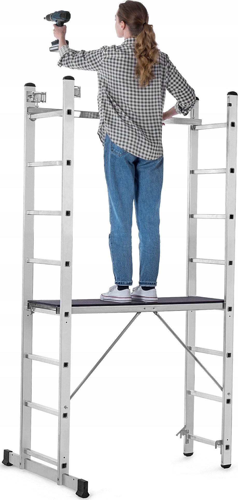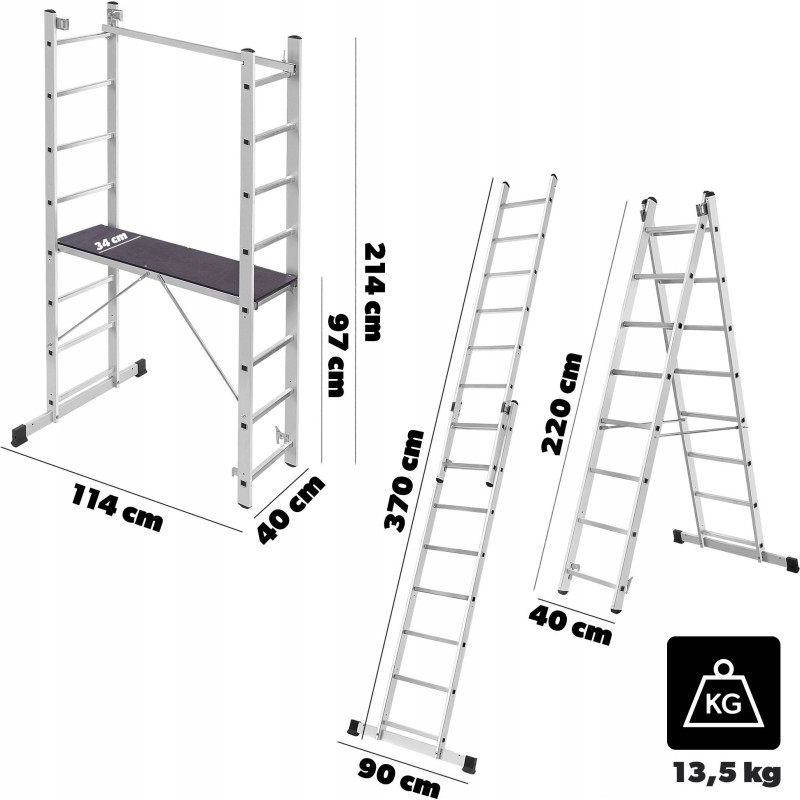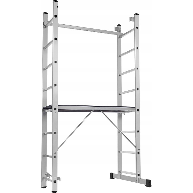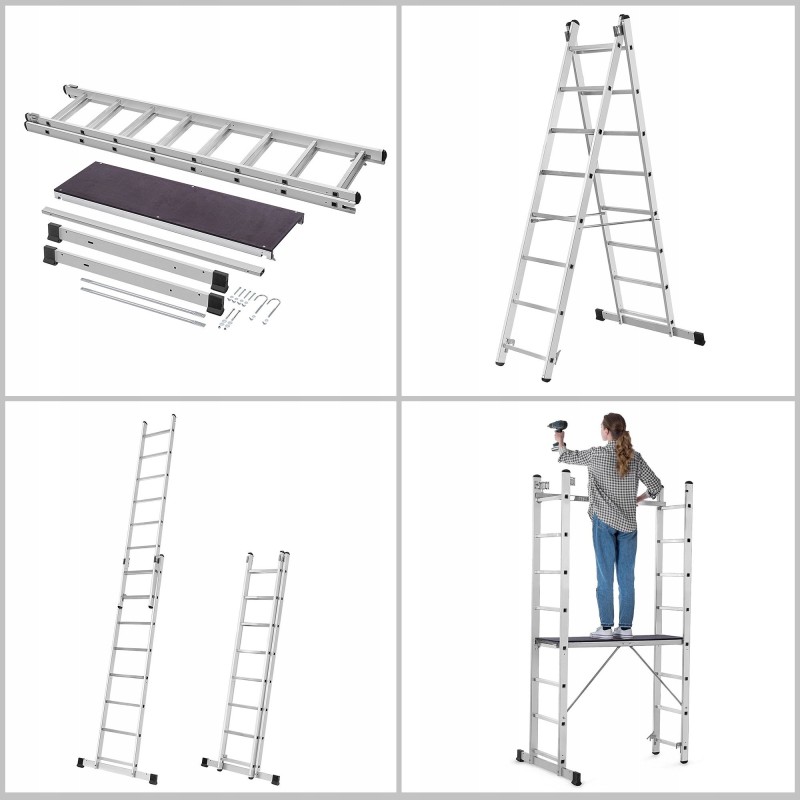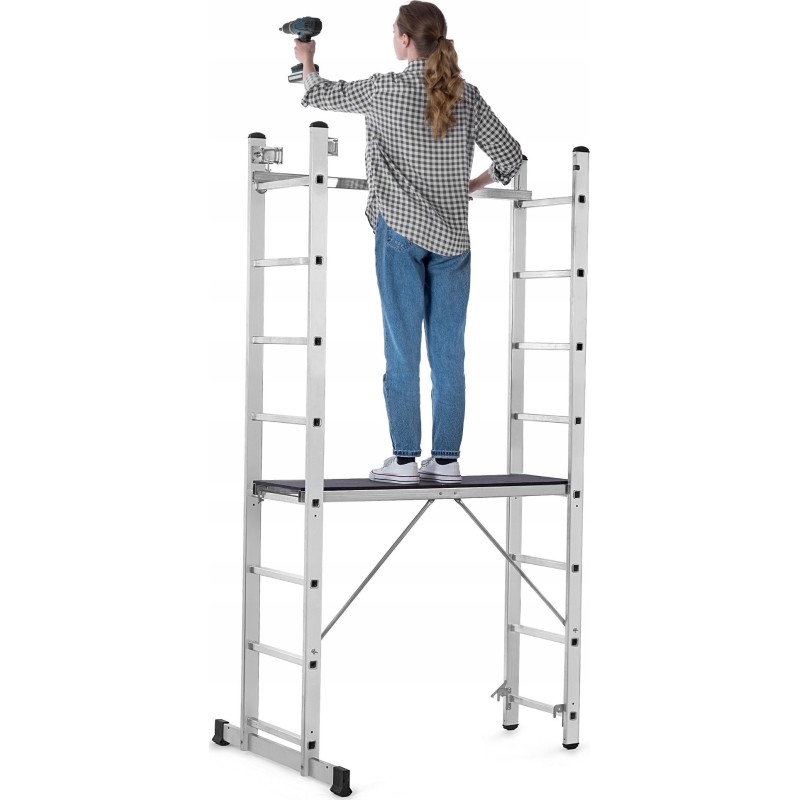 Dieses Modell kann als Gerüst, Anlehner oder freistehende Leiter verwendet werden, was seine Vielseitigkeit erheblich erhöht. Dadurch lässt es sich leicht an unterschiedliche Anforderungen und Arbeitsbedingungen anpassen.