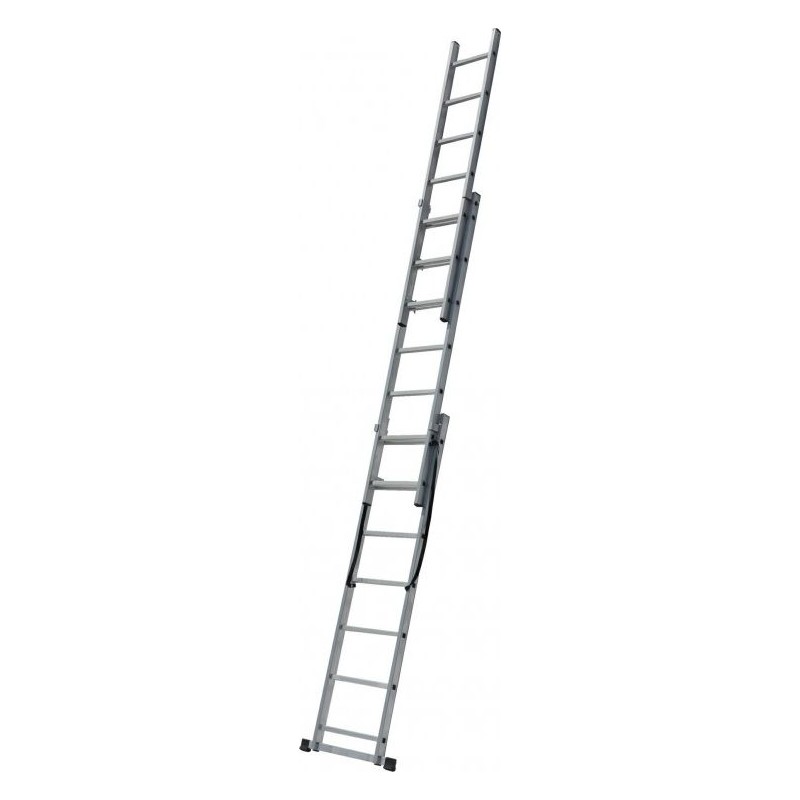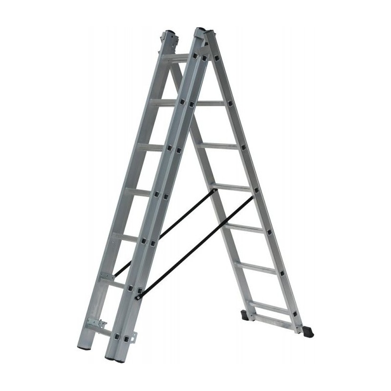 • Kombinierte Leiter, geeignet für den gewerblichen Einsatz, kann als Anlegeleiter, freistehende Verlängerungsleiter, Stehleiter und Treppenleiter verwendet werden. Rutschfeste Auflagen verhindern ein Verrutschen der Leiter und schützen den Boden vor Kratzern. Quadratische Sprossen mit flacher Oberseite sorgen für zusätzlichen Halt und Komfort. Breite rutschfeste Trittflächen für Komfort und Sicherheit. Die Trittflächen sind mit Nieten sicher an den Holmen befestigt und mit Schutzkappen versehen. Robuste, aber leichte Aluminiumkonstruktion. Hergestellt gemäß der europäischen Norm EN131. Maximale Belastbarkeit: 150 kg