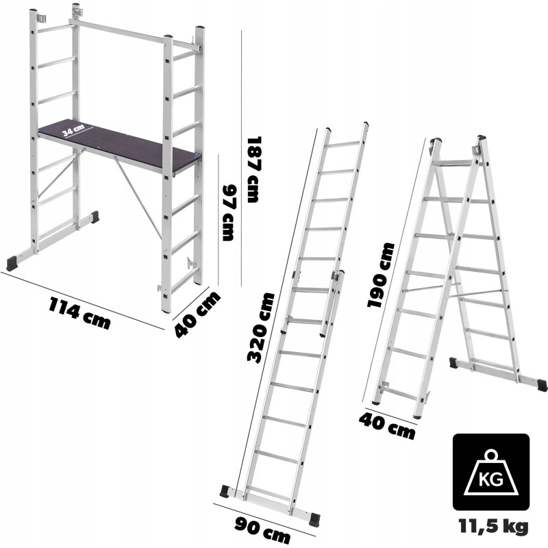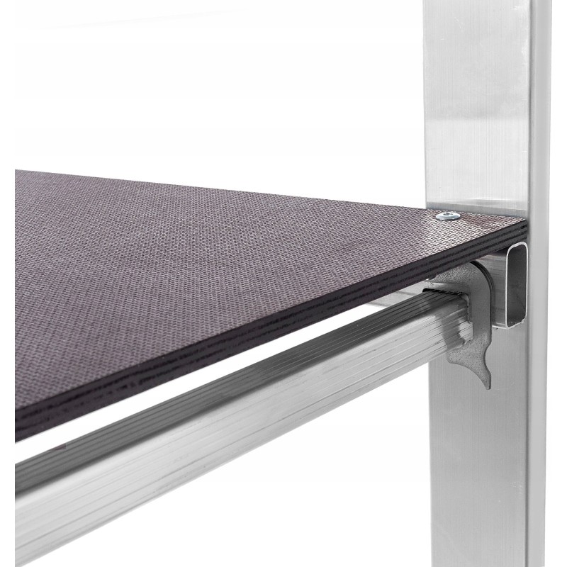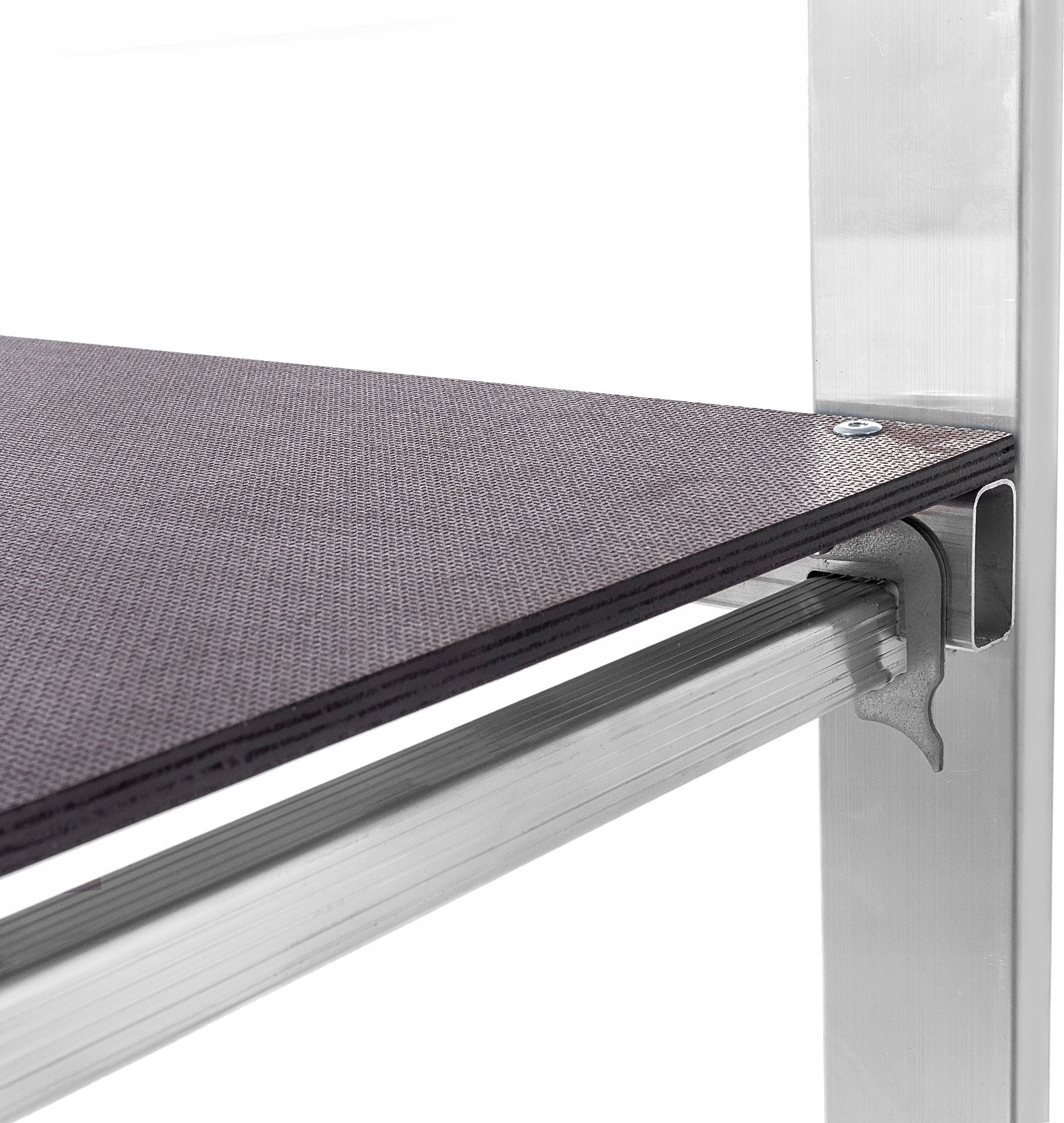 Die Plattform mit den Maßen 34 x 114 cm bietet ausreichend Arbeitsfläche. Ihre solide Konstruktion und der verstärkte Stabilisierungsbalken garantieren Komfort und Sicherheit, was bei Arbeiten in der Höhe entscheidend ist.