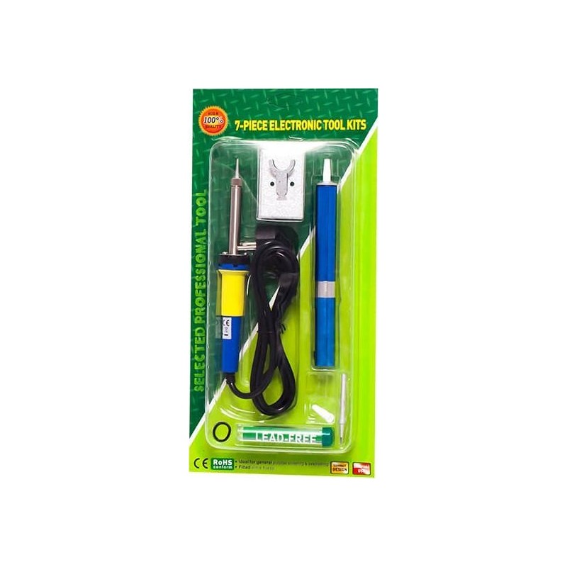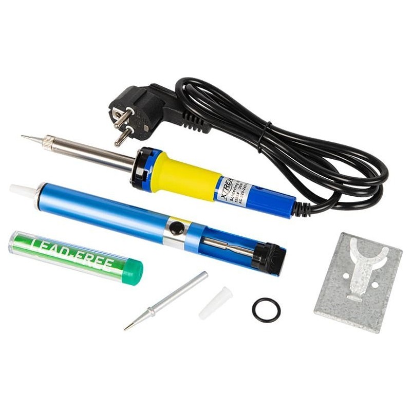 Löt-Set zum Löten kleiner elektronischer Bauteile. Das Heizelement im Lötkolben wurde durch eine dicke Stahlspitze ersetzt. Geeignet für Hobbyarbeiten sowie für den professionellen Einsatz. Der mit einer Gummihülle überzogene Griff sorgt für Sicherheit und komfortables Arbeiten. Das Set enthält: Lötkolben, Lötabsauger mit Aufsätzen, Lötkolbenständer, Zinn in einer Flasche.