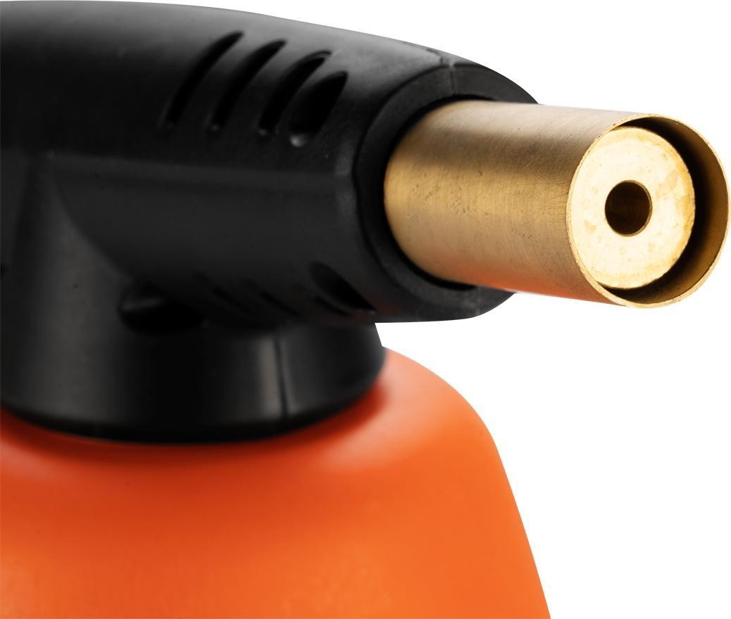 Gaslötlampe für 190-g-Kartuschen, Betriebstemperatur 1350 °C, Leistung 1,2 kW, durchschnittlicher Gasverbrauch 87 g/h, Brenner aus Messing, Gehäuse aus Kunststoff.
