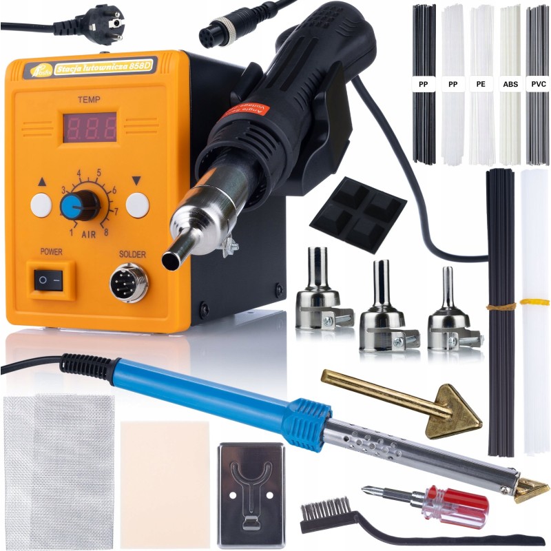 Set: Heißluft-Lötstation Rosfix 858D + Set mit 3 Düsen + Lötkolben vom Typ Bügeleisen Rosfix Blue Lark 80W BL80W mit Zubehörset (Kunststoff, Netze) Serie Electric S + Komplettes Set an Schweißmitteln für Kunststoff (5 Sorten – 2x PP, PE, ABS, PVC)