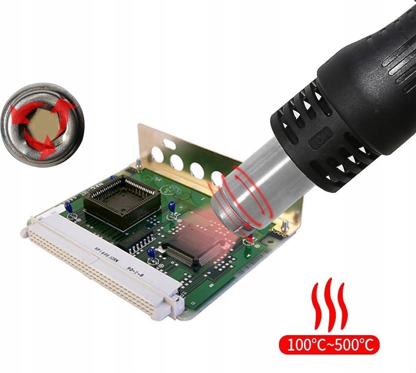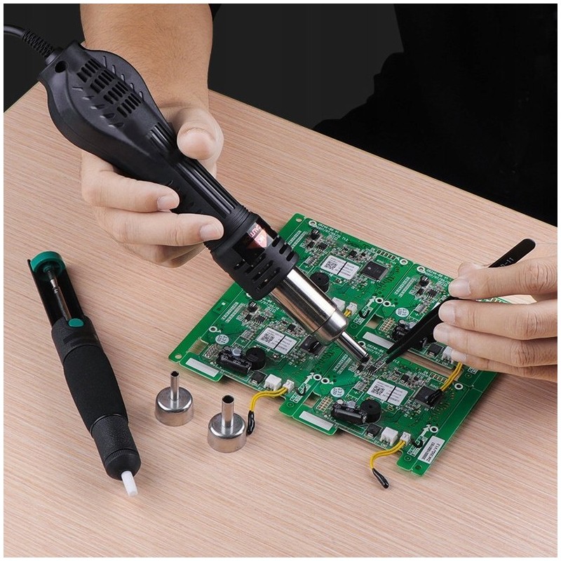 Im Lieferumfang sind drei austauschbare Düsen mit Durchmessern von 3,5 mm, 6,5 mm und 9 mm enthalten, wodurch der Luftstrom präzise an die jeweilige Aufgabe angepasst werden kann. Dadurch ist der Heißluftlötkolben äußerst vielseitig und eignet sich für zahlreiche Anwendungen, vom Löten bis hin zum Formen und Reparieren von Kunststoffteilen.
