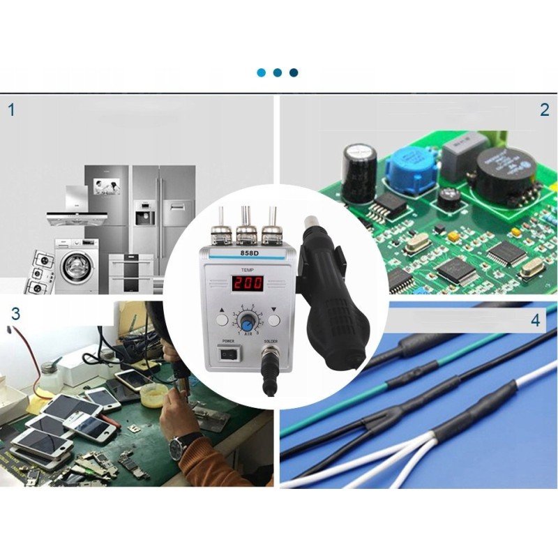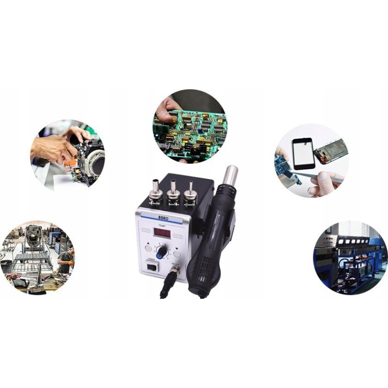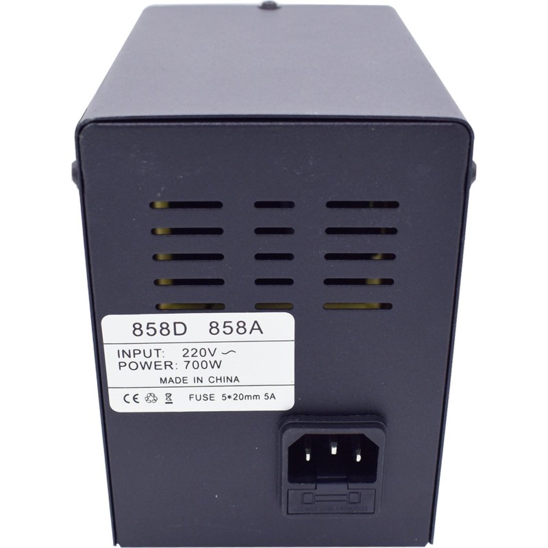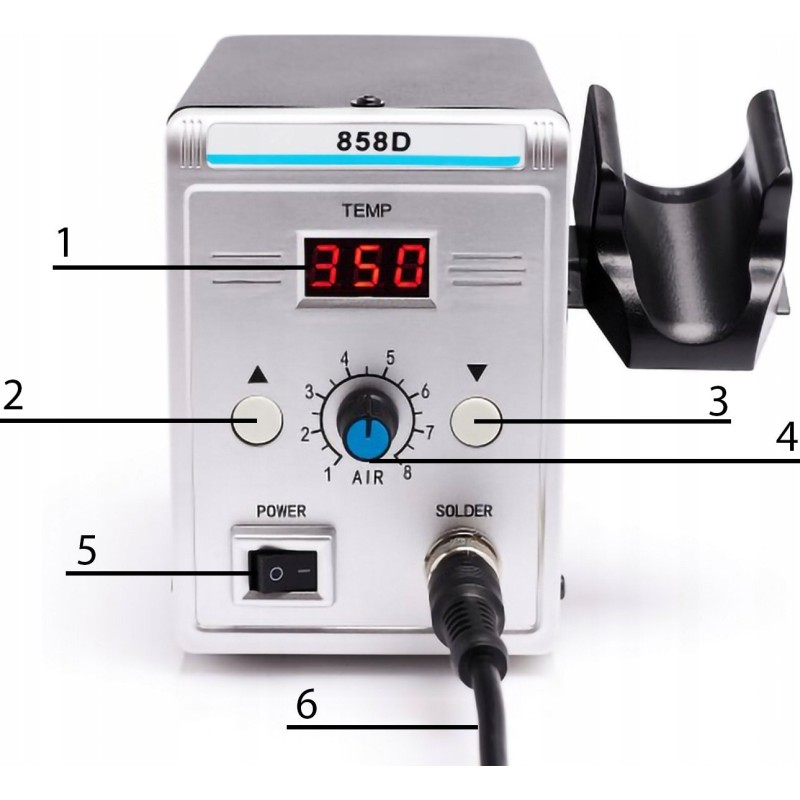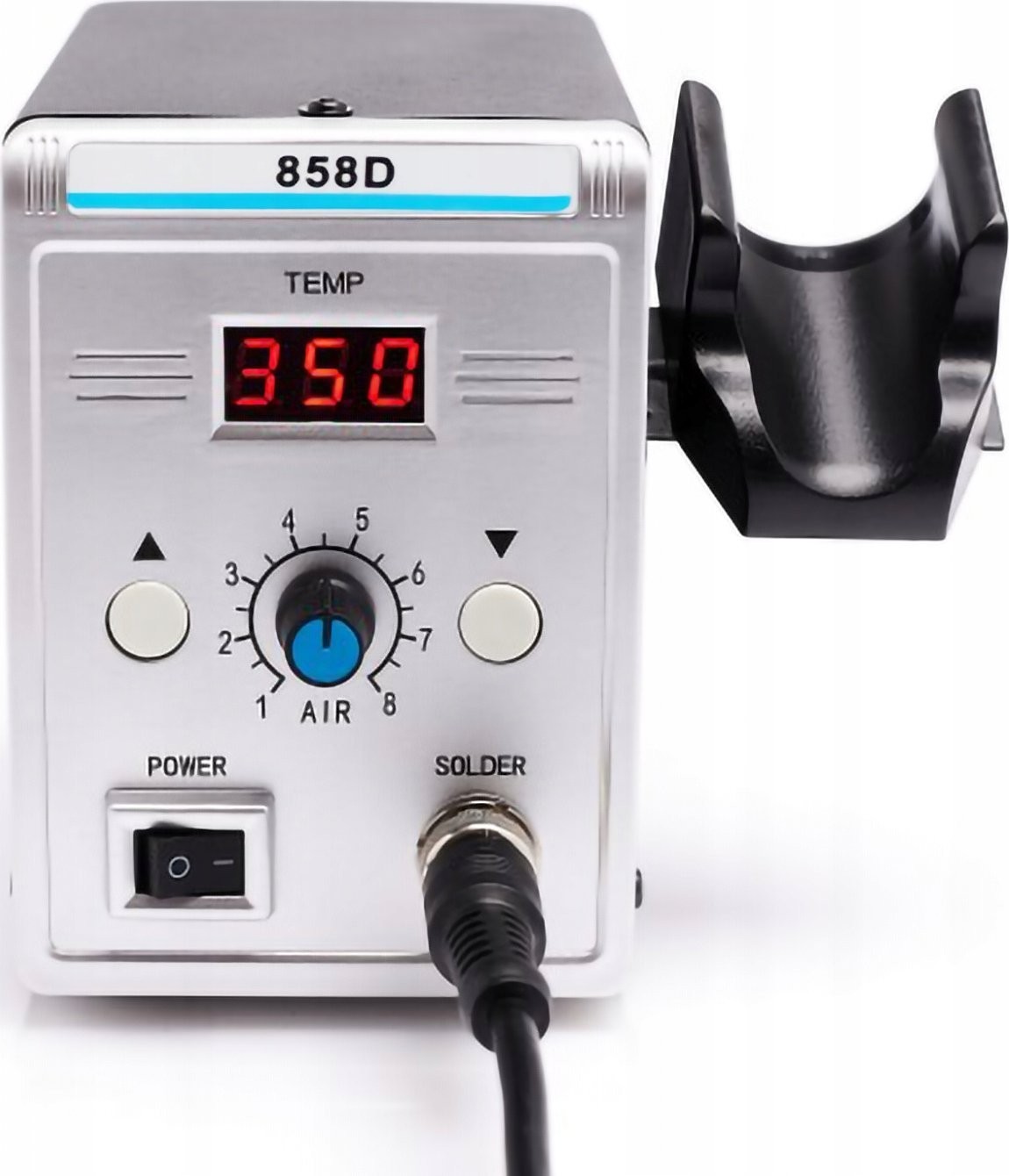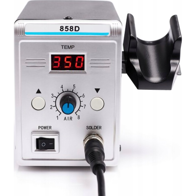 Das Gerät verfügt über eine Leistung von 700 W, was ein effektives und schnelles Löten gewährleistet. Dadurch ermöglicht der Lötkolben 858D die präzise Ausführung von Aufgaben, selbst unter schwierigen Bedingungen. Ein leistungsstarker Lüfter garantiert einen stabilen Betrieb, was sich in hohem Bedienkomfort niederschlägt.