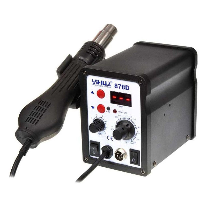 Die Lötstation Yihua 878D ist mit einem leistungsstarken Heizelement ausgestattet, das ein schnelles Aufheizen und eine lange Lebensdauer des Heizelements garantiert. Sie verfügt über eine stufenlose Regelung von Luftstrom und Temperatur. Im Griff des Lötkolbens ist ein Gebläse mit einem hohen Luftdurchsatz von maximal 120 l/min eingebaut; sein bürstenloser Motor arbeitet leise und sorgt für einen stabilen Luftstrom. Die Station wurde für Lötarbeiten an Bauteilen wie SOIC-, QFP-, PLCC-, BGA- und SMD-Schaltungen entwickelt... sowie zum Erwärmen, Ausheizen von Schrumpfschläuchen, Auftauen, Auflösen von Klebstoffen, Ausbrennen von Farben, Vorwärmen usw.