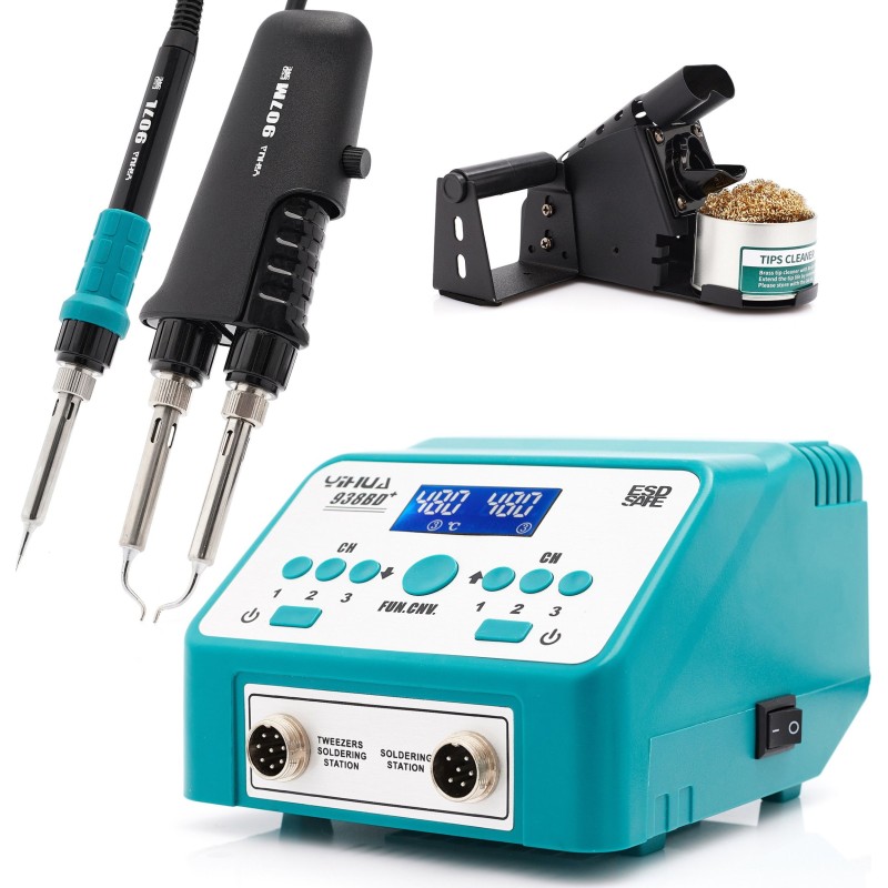 Set: Lötstation / Heißluftpistole Yihua 938BD+ 2-in-1 + Leiterplattenhalter + Pinzette + Flussmittel + Kapton