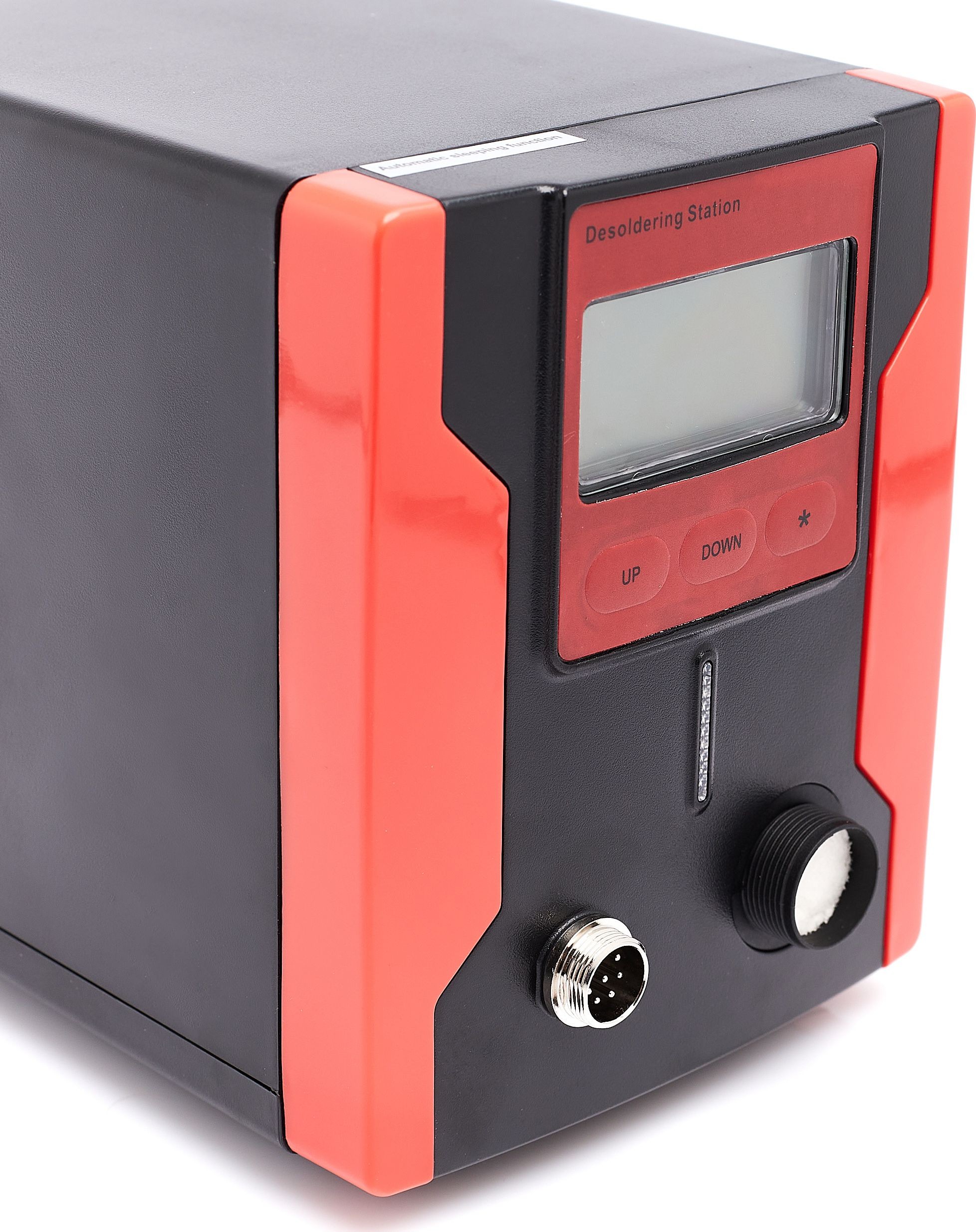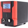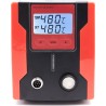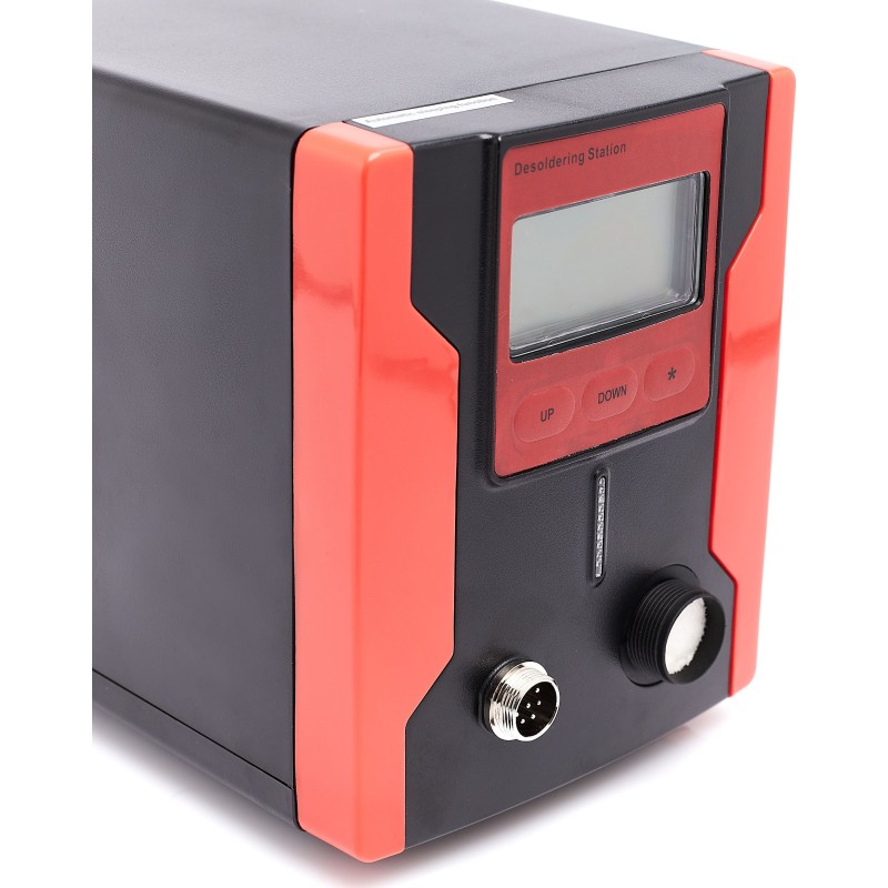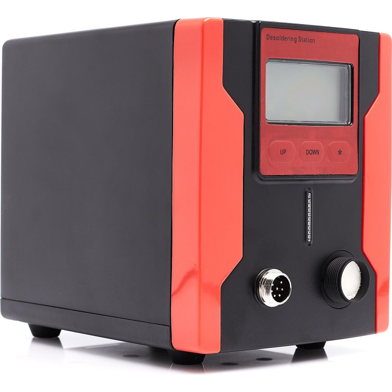 Lötstation zum Entfernen von elektronischen Bauteilen von Leiterplatten (PCB). Die Station verfügt über einen eingebauten Kompressor, der beim Betätigen des Pistolenabzugs startet und einen Unterdruck erzeugt. Im Vergleich zu herkömmlichen Absauggeräten ist sie komfortabler und ermöglicht ein schnelleres Arbeiten – sie erhitzt das Zinn selbst. Die Zentraleinheit ist mit einem großen und gut lesbaren LCD-Display mit Hintergrundbeleuchtung ausgestattet, das sowohl die eingestellte Temperatur als auch die an der Lötspitze gemessene (abgelesene) Temperatur anzeigt. Die Temperatur ist in Schritten von 1 °C im Bereich von 160 °C bis 480 °C einstellbar. Die Station verfügt über eine Sleep-Funktion, die die Lebensdauer des Heizelements verlängert: Wenn die Lötpistole 15 Minuten lang nicht benutzt wird, kühlt der Kolben automatisch auf 200 °C ab; sobald der Kolben angehoben wird, erfolgt eine erneute Aufheizung auf die eingestellte Temperatur. Das leistungsstarke 90-W-Heizelement bewältigt viele schwierige Fälle. Die Station ist aus hochwertigen Materialien gefertigt und sieht in ihrer roten Farbe phänomenal aus.
