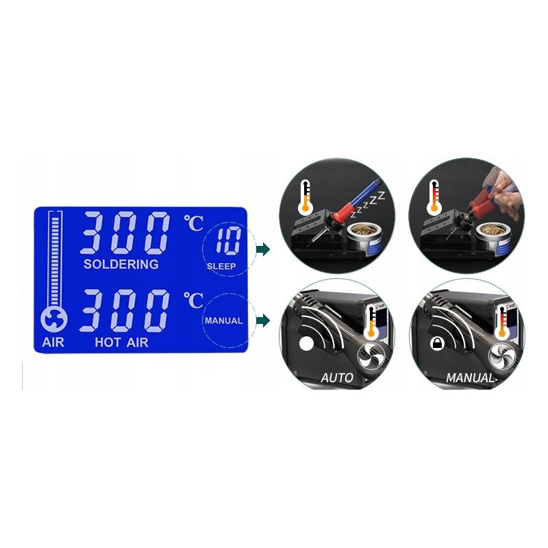 Manueller Modus: Diese Funktion ermöglicht es, den Heißluftkolben bei konstanter Temperatur zu lagern und die Arbeit wieder aufzunehmen, ohne jedes Mal abkühlen und aufheizen zu müssen, was Zeitverlust und den Verschleiß der Heizelemente reduziert.