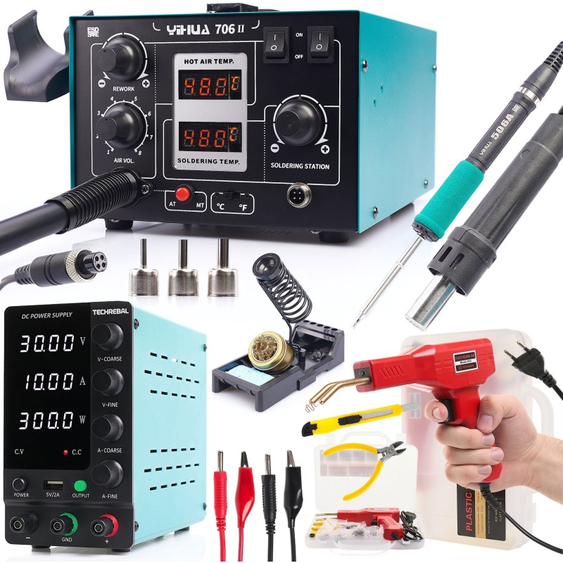 Die Heißluft-Lötstation 706 II ist eine Komplettlösung, die alle notwendigen Zubehörteile enthält, darunter das Labornetzteil Techrebal SPS-F305. So haben Anwender alles, was sie für effizientes Arbeiten benötigen, in einem Set.