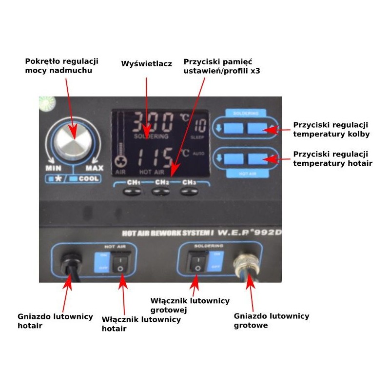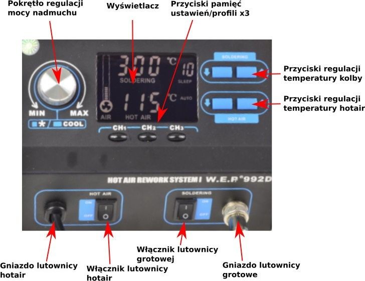 Der Lötkolben YIHUA 992D+ FAN ist eine Heißluft-Lötstation und ein Lötkolben. Die Station ist mit einem PID-Mikroprozessor ausgestattet, der in 20-ms-Zyklen die Betriebsparameter der Station überprüft und auf die voreingestellten Werte korrigiert.