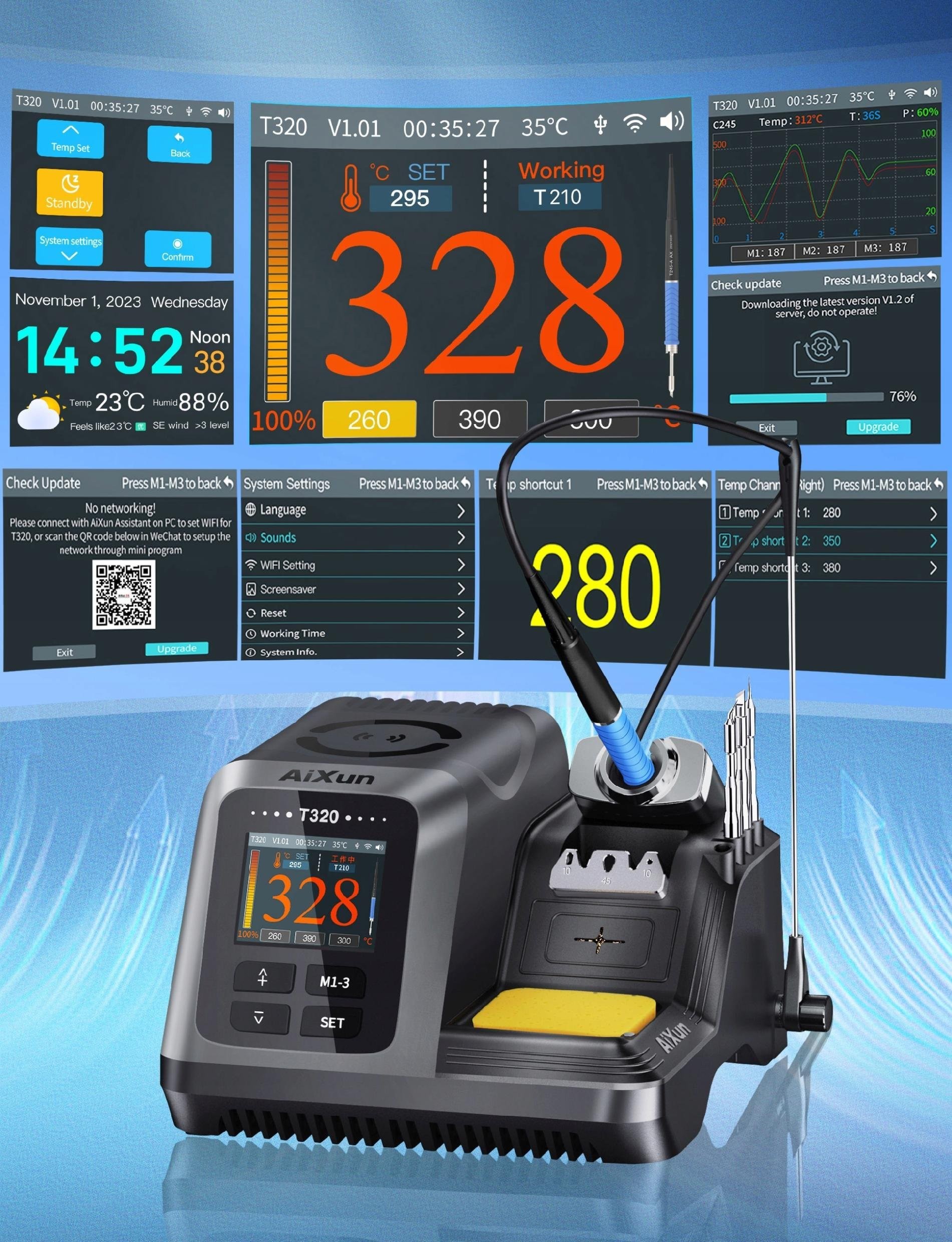 Die Lötstation Aixun T320 bietet die Möglichkeit einer schnellen und bequemen Software-Aktualisierung, sodass Sie stets die neuesten Funktionen des Geräts nutzen können. Aktualisierungen können auf zwei Arten durchgeführt werden: drahtlos über WLAN oder über ein USB-C-Kabel. Regelmäßige Updates erweitern die Funktionalität des Geräts und gewährleisten optimale Leistung im täglichen Arbeitsablauf. Dies ist eine praktische Lösung, mit der Sie die Möglichkeiten Ihres professionellen Lötgeräts kontinuierlich erweitern können.