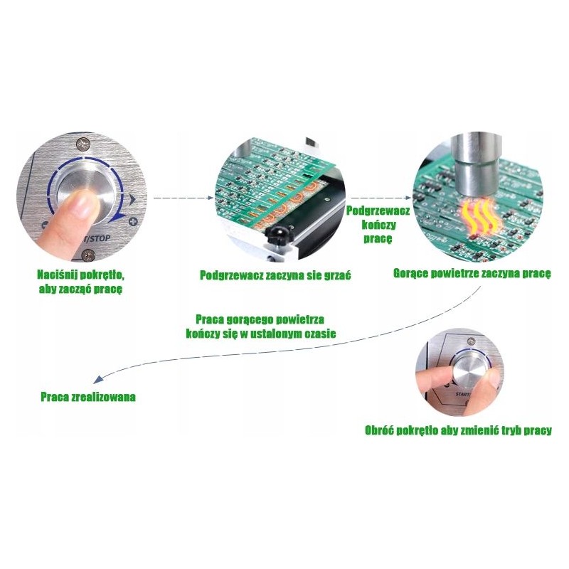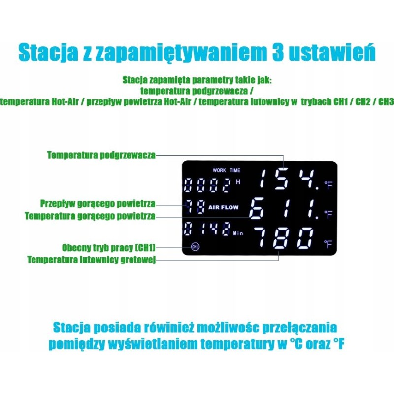 Das Gerät bietet einen großen Temperaturregelungsbereich von 100 bis 480 °C für den Heißluftlötkolben und von 200 bis 480 °C für den Lötkolben mit Lötspitze. Dadurch hat der Benutzer die volle Kontrolle über den Lötprozess und kann die Parameter an spezifische Anforderungen anpassen.