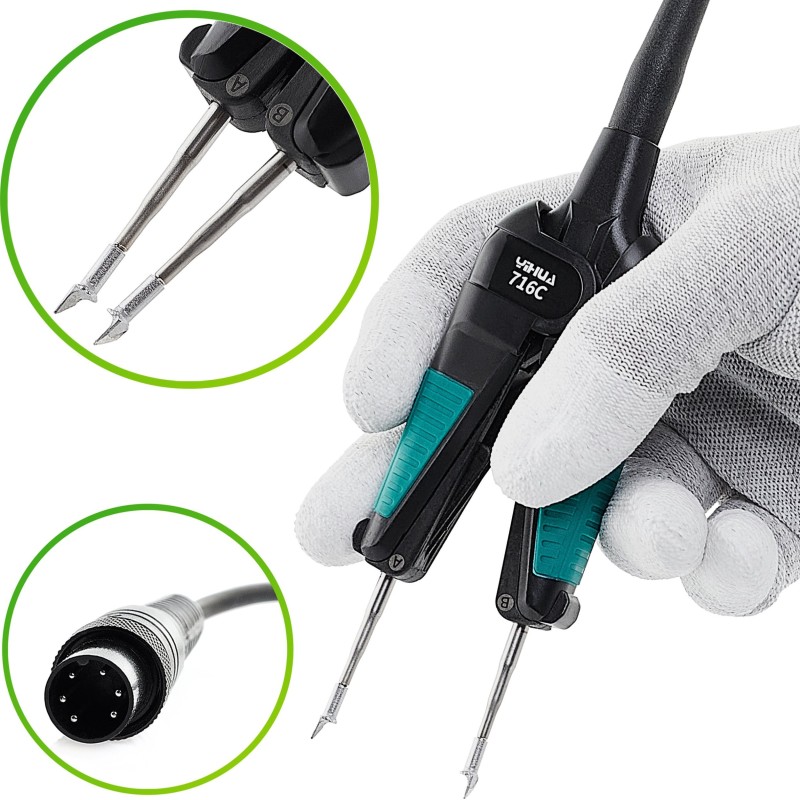Die Station ist mit einer schmalen Spitze ausgestattet, die sich ideal für die Arbeit mit sehr kleinen SMD-Bauteilen wie Widerständen, Kondensatoren, Induktivitäten, LEDs, Sicherungen und anderen eignet.