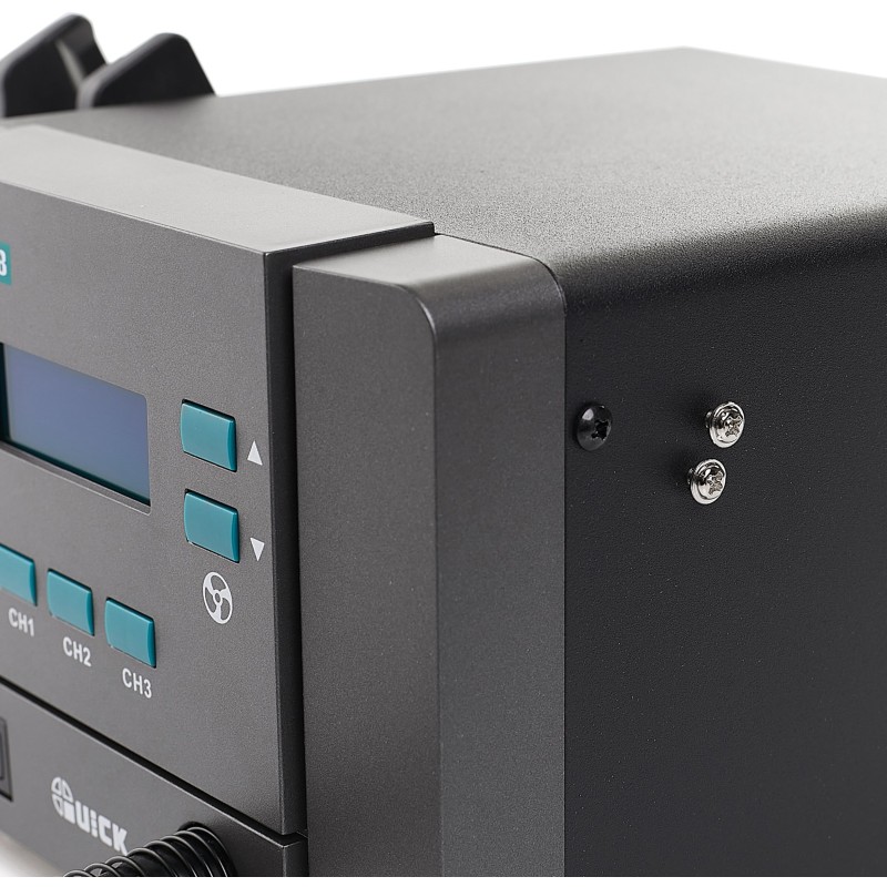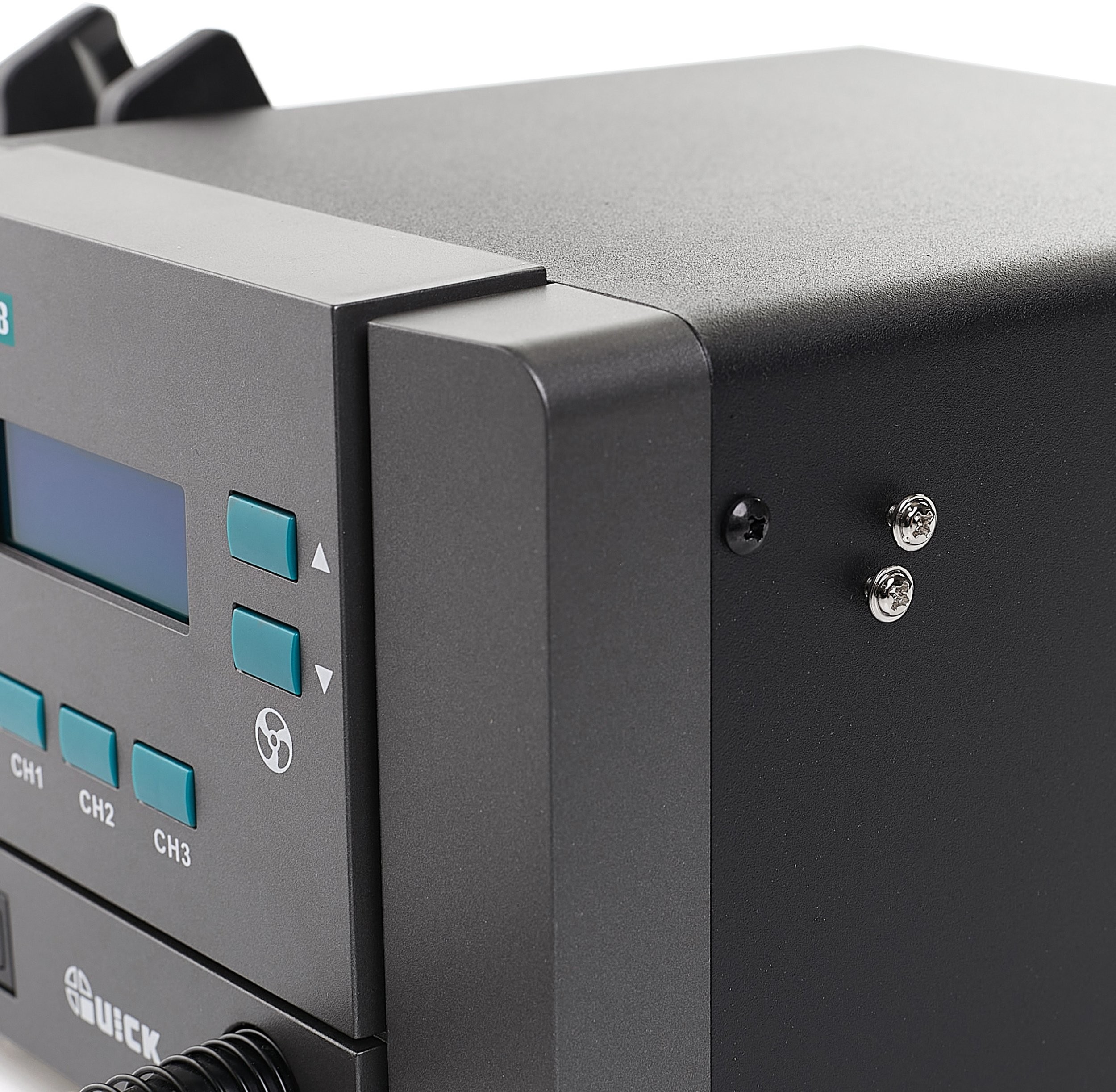 Mit dem Quick K8 lässt sich die Temperatur präzise im Bereich von 100 bis 500 °C einstellen und der Luftstrom von 1 bis 120 l/min regulieren. Dank drei unabhängiger Kanäle (CH1, CH2, CH3) kann der Anwender schnell zwischen verschiedenen Einstellungen wechseln, was die Arbeitseffizienz erheblich steigert.