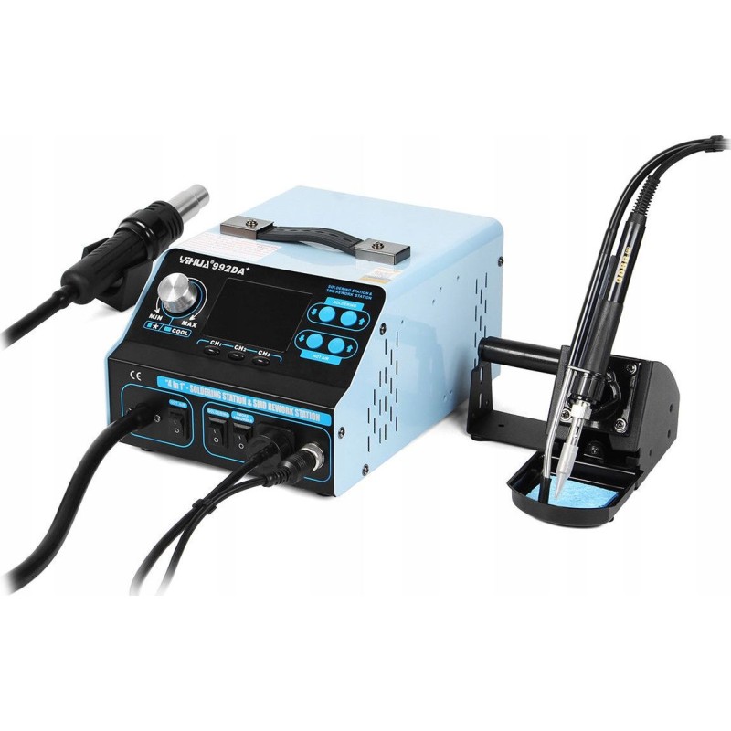 Das Gerät Yihua 992DA+ ist eine Heißluft-Lötstation (Hotair) sowie ein Lötkolben (75 W) und wird zum Löten und Entlöten von elektronischen Bauteilen verwendet. Die Station ist mit einem Mikroprozessor mit präzisem PID-Regler ausgestattet, der die Betriebsparameter überprüft und auf die vorgegebenen Werte korrigiert