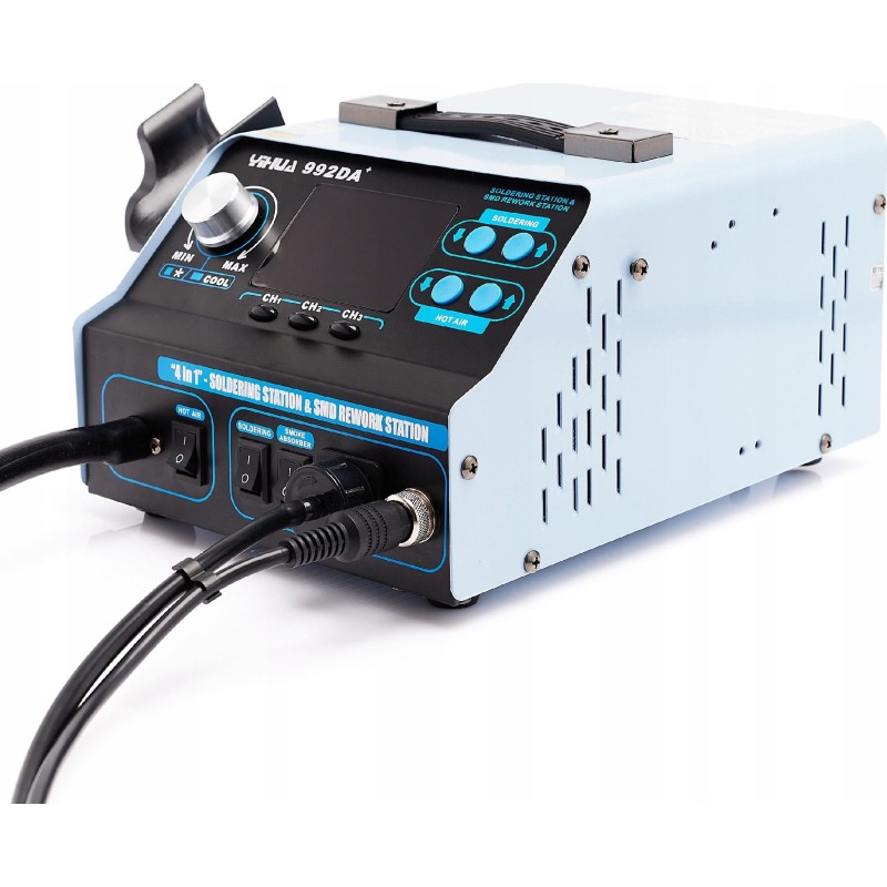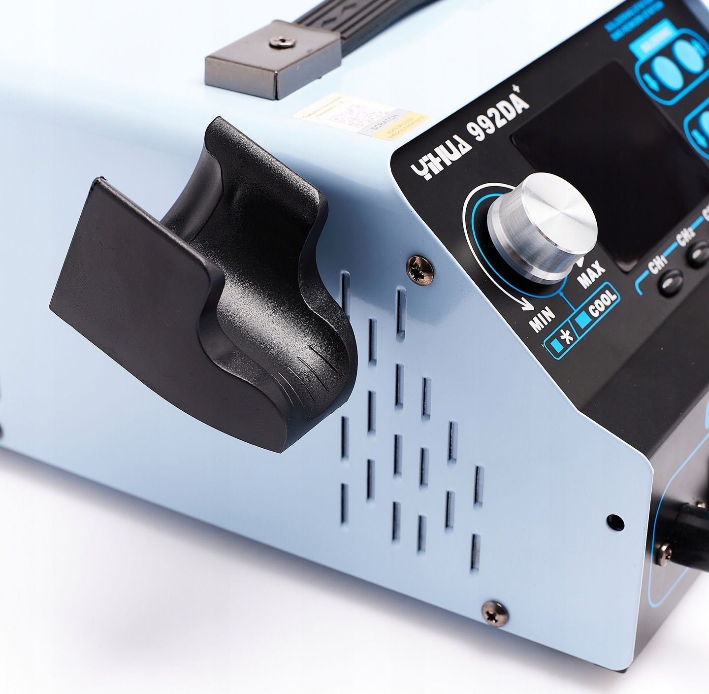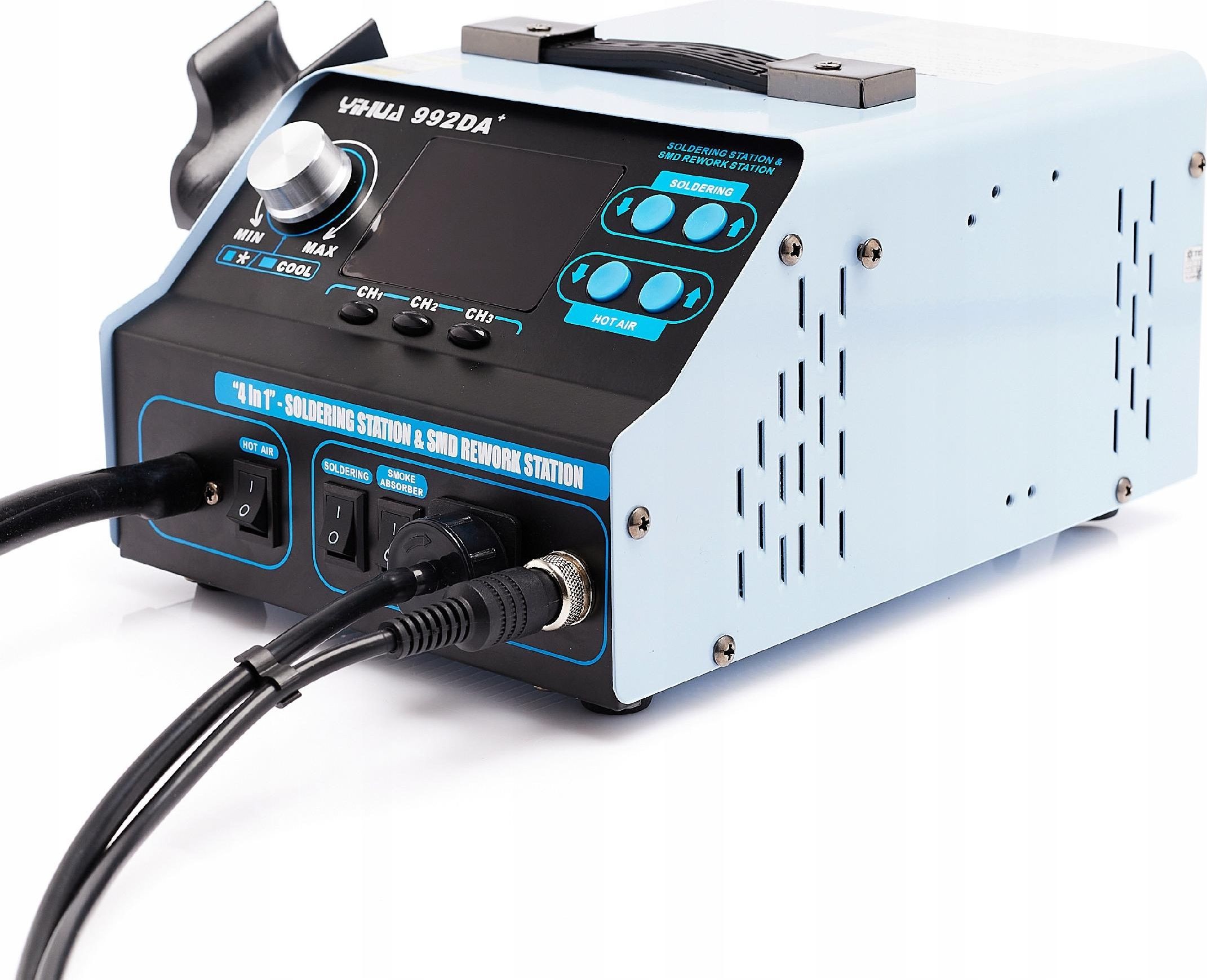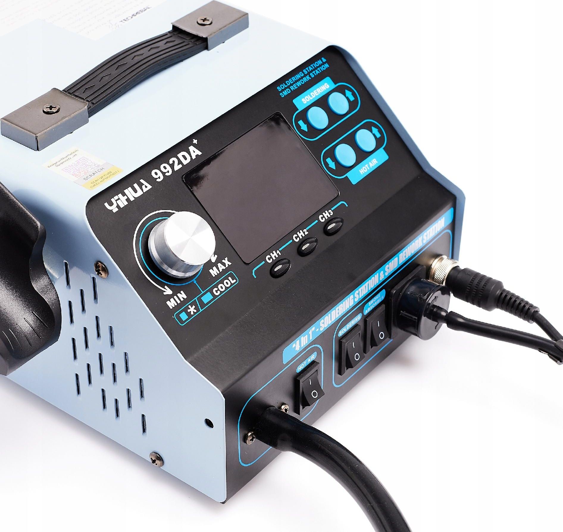 Das Gerät Yihua 992DA+ ist eine Heißluft-Lötstation (Hotair) sowie ein Lötkolben (75 W) und wird zum Löten und Entlöten von elektronischen Bauteilen verwendet. Die Station ist mit einem Mikroprozessor mit präzisem PID-Regler ausgestattet, der die Betriebsparameter überprüft und auf die vorgegebenen Werte korrigiert.