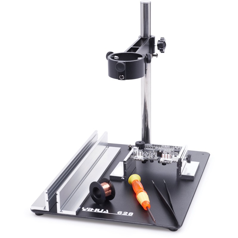 Im Lieferumfang enthalten ist ein Halter für den Hot-Air-Lötkolben mit magnetischem Tisch Yihua 628, der für komfortables Arbeiten sorgt und es ermöglicht, die Hände beim Löten frei zu haben. Diese innovative Lösung erhöht die Effizienz und den Bedienkomfort.