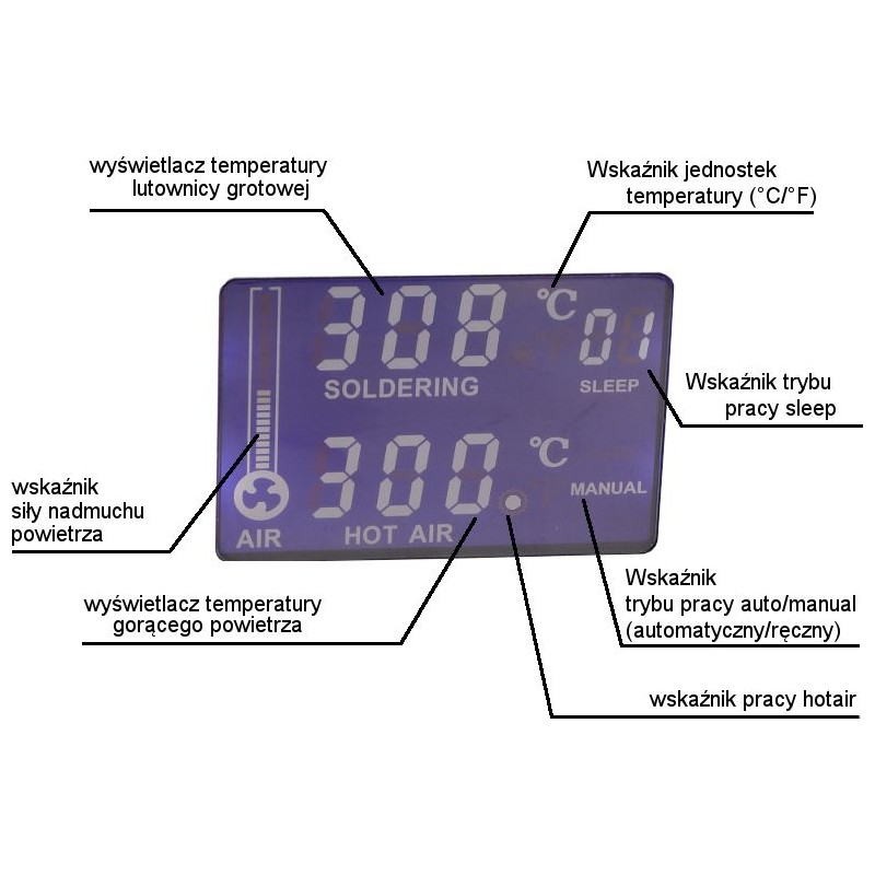 Wenn Sie den Automatikmodus wählen und den Heißluftkolben auf den Ständer legen, stellt das Gerät automatisch die Heizung ein und kühlt auf eine sichere Temperatur ab. Dadurch sorgen wir für einen langen, störungsfreien Betrieb des Heizelements, Energieeinsparungen und die Sicherheit des Geräts.
