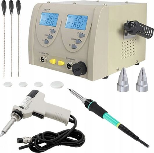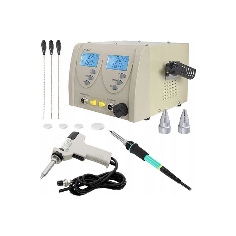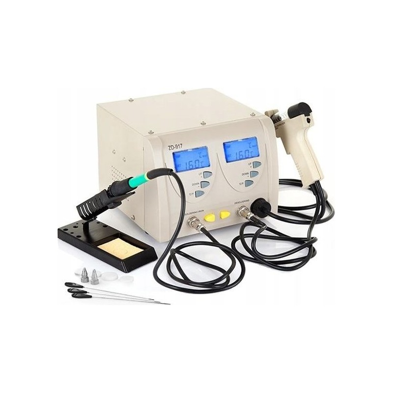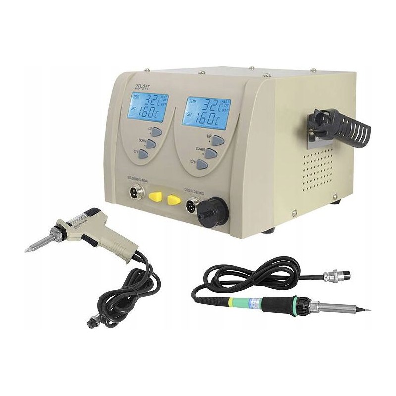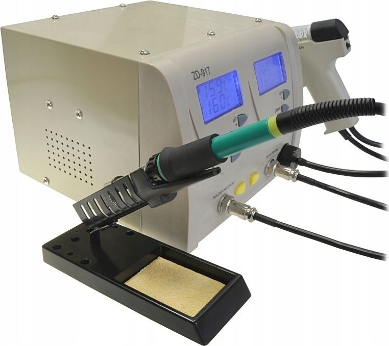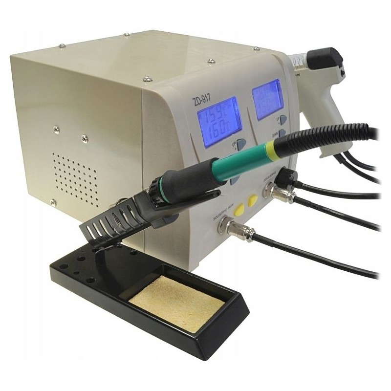 Lötstation zum Entfernen von elektronischen Bauteilen von Leiterplatten (PCB). Die Station verfügt über einen eingebauten Kompressor, der beim Drücken des Pistolenabzugs startet und einen Unterdruck erzeugt. Im Vergleich zu herkömmlichen Absauggeräten ist sie komfortabler und ermöglicht ein schnelleres Arbeiten – sie erhitzt das Zinn selbst. Die Zentraleinheit ist mit einem großen und gut lesbaren LCD-Display mit Hintergrundbeleuchtung ausgestattet, das den eingestellten Temperaturwert sowie die am Lötspitzenmessfühler gemessene (abgelesene) Temperatur anzeigt. Die Temperatur ist in Schritten von 1 °C im Bereich von 160 °C bis 480 °C einstellbar. Die Station ZD-917 besteht aus hochwertigen Bauteilen und zeichnet sich durch hohe Präzision aus. Sie kann zum Löten/Einlöten aller Arten von integrierten Schaltkreisen von Leiterplatten ohne Beschädigungsrisiko sowie zum typischen Löten von elektronischen Bauteilen verwendet werden.