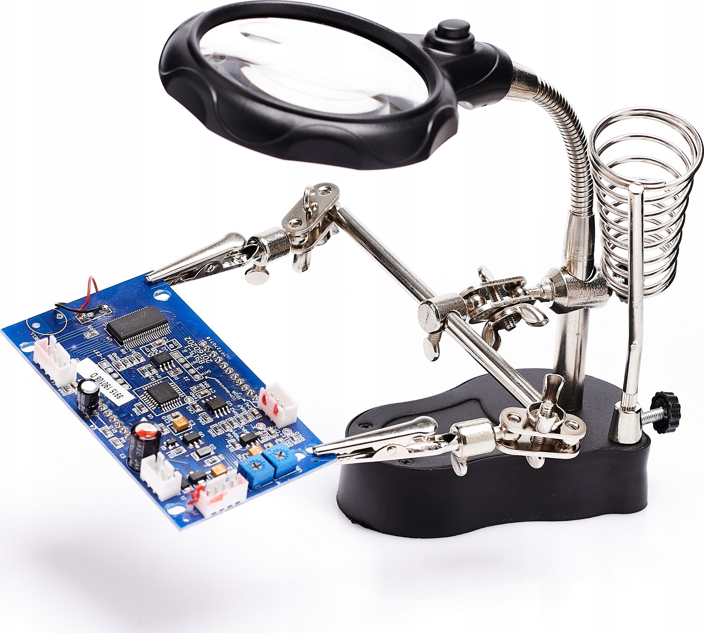 Dritte Hand mit Lupe, LED-Beleuchtung und Halterung für Lötkolben – ZD-126-2. Die Lupe mit Arbeitsbereichsbeleuchtung und die Halterung für den Lötkolben erleichtern die Arbeit erheblich. Im Set enthalten ist eine verstellbare Lupe mit Vergrößerungslinse und integrierter LED-Beleuchtung. Dank der großen Vergrößerungslinse und der 2 x LED-Leuchten ist das Bild sehr klar und deutlich. Sie kann von Juwelieren, Numismatikern, Elektronik-Servicetechnikern, Uhrmachern usw. verwendet werden. Ein ideales Set für elektronische und elektrische Arbeiten.