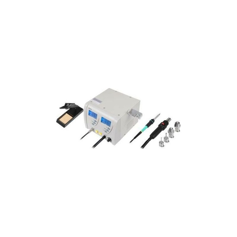 SMD-Heißluft-Lötstation und herkömmlicher Lötkolben in einem – Stromversorgung: 220–240 V Wechselstrom/50 Hz – Luftpumpenleistung: 24 l/min (max.) – Löttemperatur: 160 °C–480 °C – zwei unabhängige Displays und Bedienfelder zur Steuerung beider Lötgeräte – elektronische Temperaturregelung – im Lieferumfang sind 4 verschiedene Heißluft-Lötspitzen enthalten