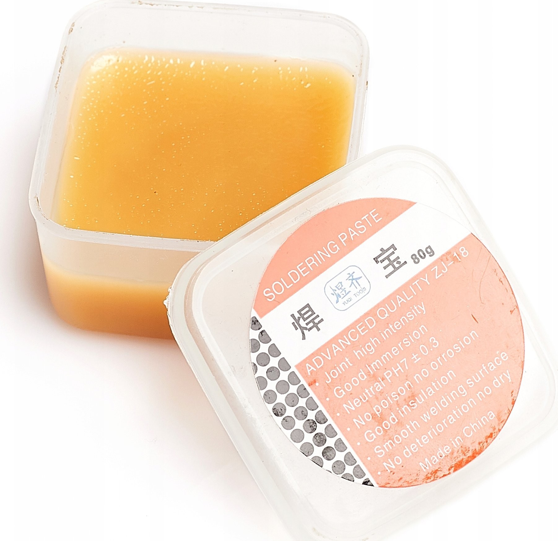 Hochwertige Lötpaste, leicht zu verteilen, mit hoher Benetzungsfähigkeit der Lötflächen. Beeinträchtigt die Eigenschaften von IC- und PCB-Bauteilen nicht, korrodiert nicht und erfordert keine Reinigung. Ihr Siedepunkt liegt geringfügig über dem Schmelzpunkt des Lötzinns. Sie hat eine gelartige Konsistenz, was ihre Anwendung erleichtert.