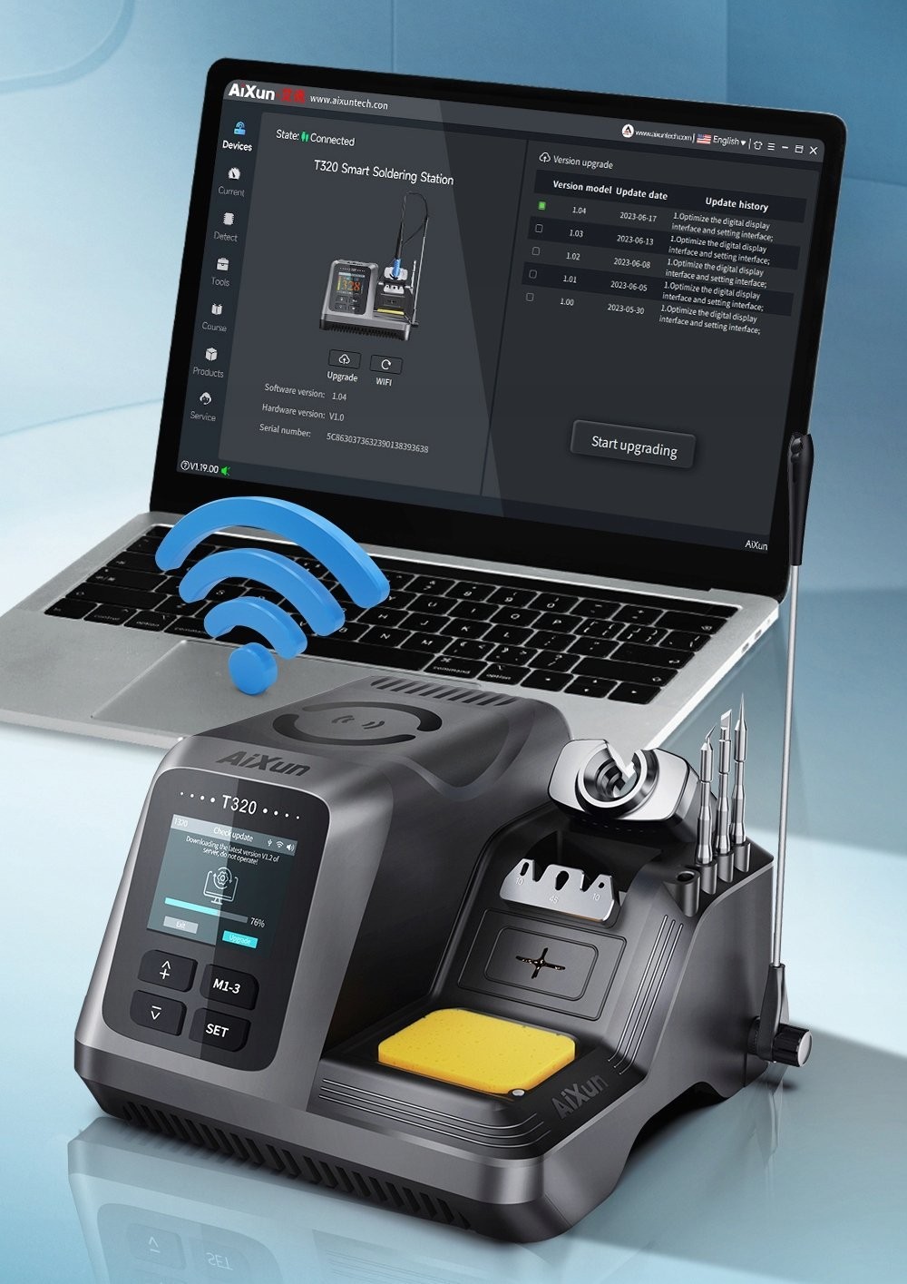 Die Lötstation Aixun T320 bietet die Möglichkeit einer schnellen und bequemen Softwareaktualisierung, sodass Sie stets die neuesten Funktionen des Geräts nutzen können. Aktualisierungen können auf zwei Arten durchgeführt werden: drahtlos über WLAN oder über ein USB-C-Kabel. Regelmäßige Updates erweitern die Funktionalität des Geräts und gewährleisten optimale Leistung im täglichen Einsatz. Dies ist eine komfortable Lösung, mit der Sie die Möglichkeiten Ihres professionellen Lötgeräts kontinuierlich erweitern können.