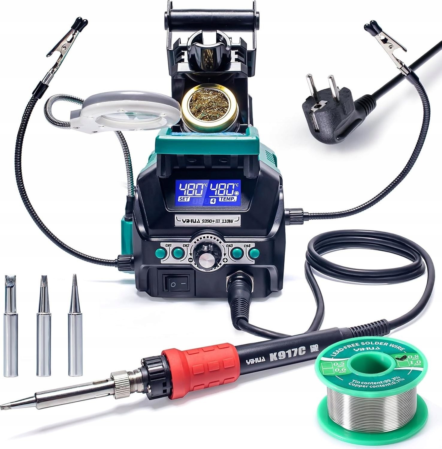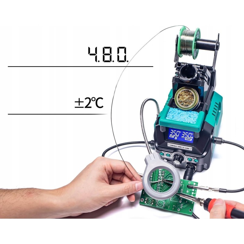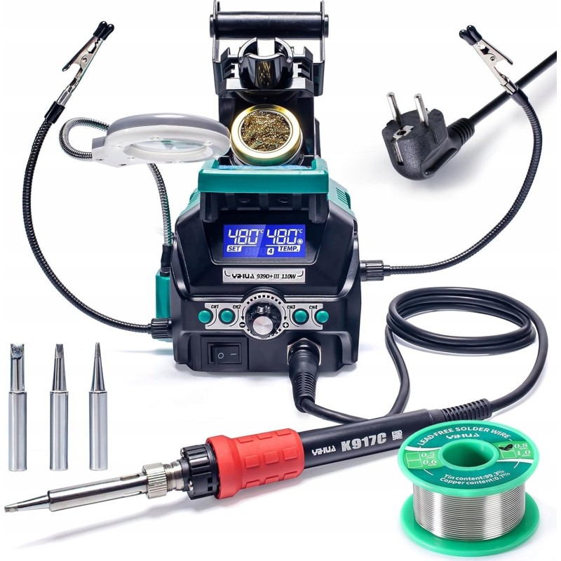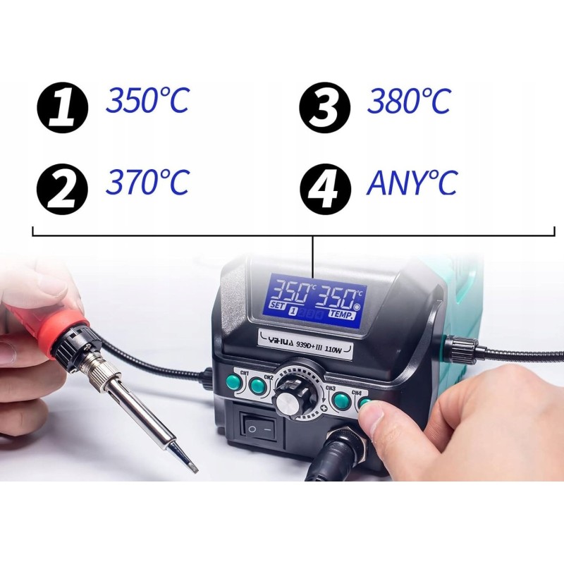 Die 939D+ III EVO 110W ist eine fortschrittliche Lötstation mit hoher Leistungsfähigkeit, Präzision und zahlreichen Funktionen wie 4 Speichereinstellungen, doppeltem LCD-Display, Schlafmodus, digitaler Temperaturkalibrierung, 2 praktischen Halterungen, einer Lupe mit LED-Beleuchtung und vielem mehr.