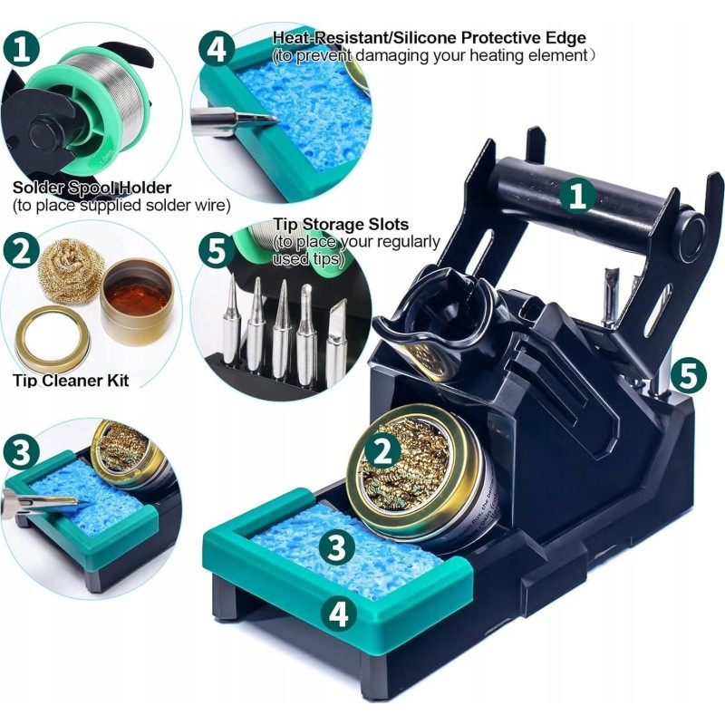 Es umfasst einen Lötkolbenhalter, ein Reinigungsset, eine Schutzablage, temporäre Fächer für Lötspitzen und eine Halterung für die Lötzinnspule in einem stabilen Halter, was für Ordnung sorgt und die Arbeitssicherheit erhöht.
