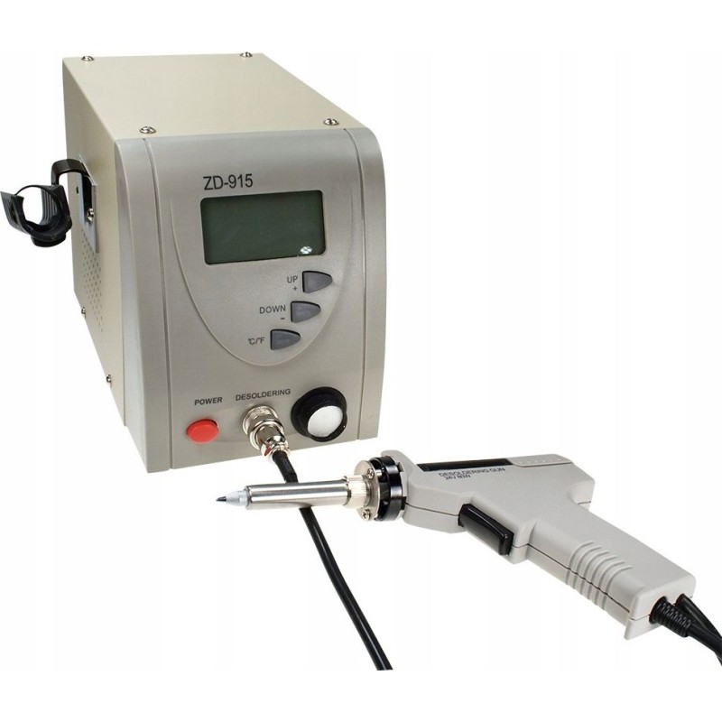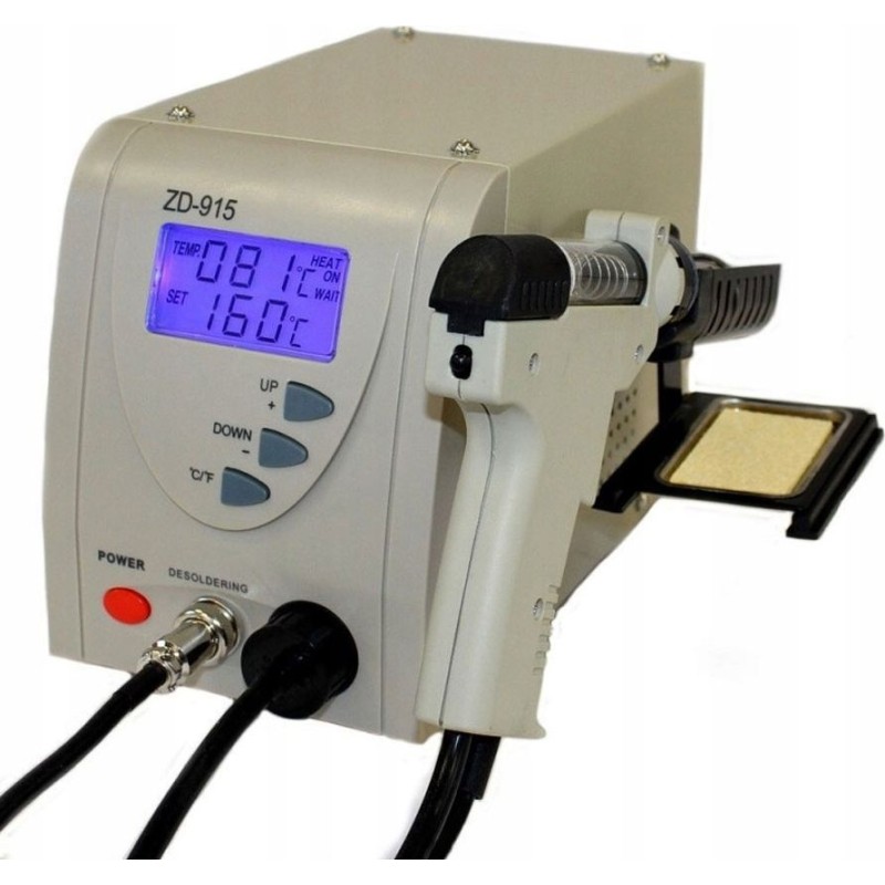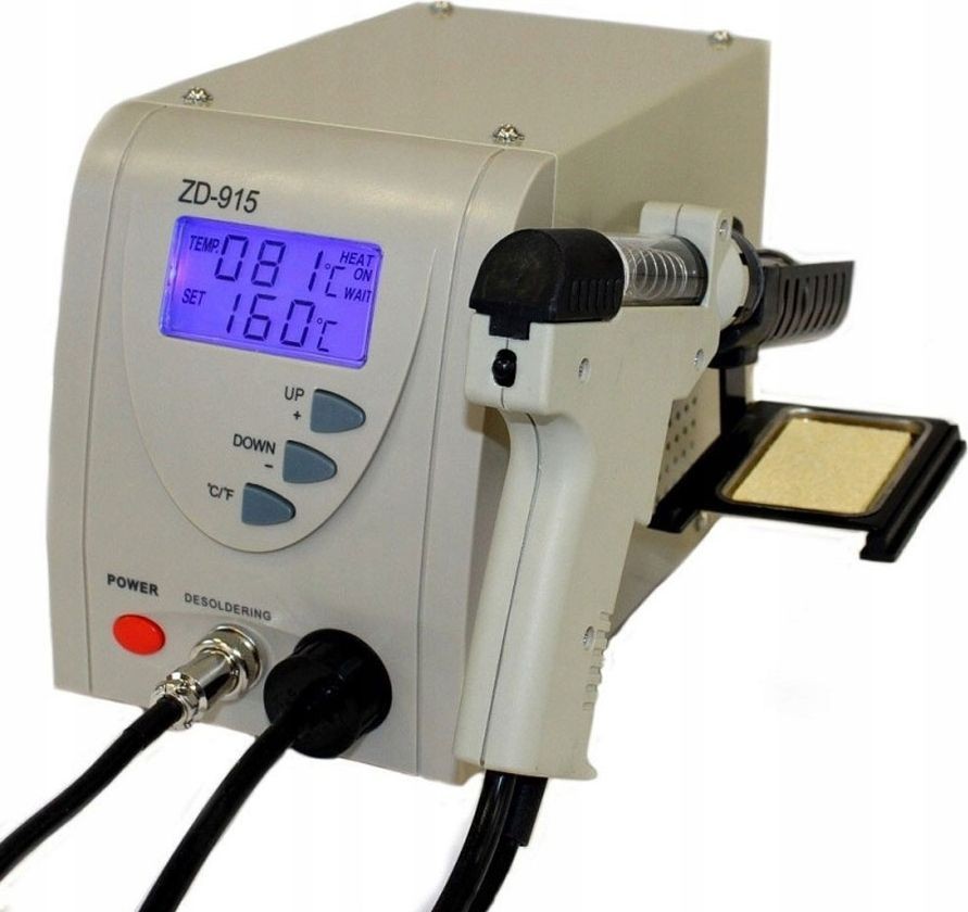 Die Entlötstation eignet sich zum Entlöten von durchgesteckten elektronischen Bauteilen aus Leiterplatten (PCBs). Eine Entlötstation ist ein unverzichtbares Element in jeder professionellen Werkstatt. Die Spitze der Entlötstation, also die Düse, wird kontinuierlich auf den eingestellten Temperaturwert erhitzt. Das Heizelement des Kolben- bzw. Pistolenkopfs ist mit einem PTC-Sensor ausgestattet, der in das leistungsstarke 90-W-Heizelement integriert ist. Das Ganze wird vom Mikroprozessor der Entlötstation ZD-915 gesteuert, der eine präzise Temperaturregelung und -stabilisierung beim Entlöten elektronischer Bauteile gewährleistet.