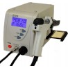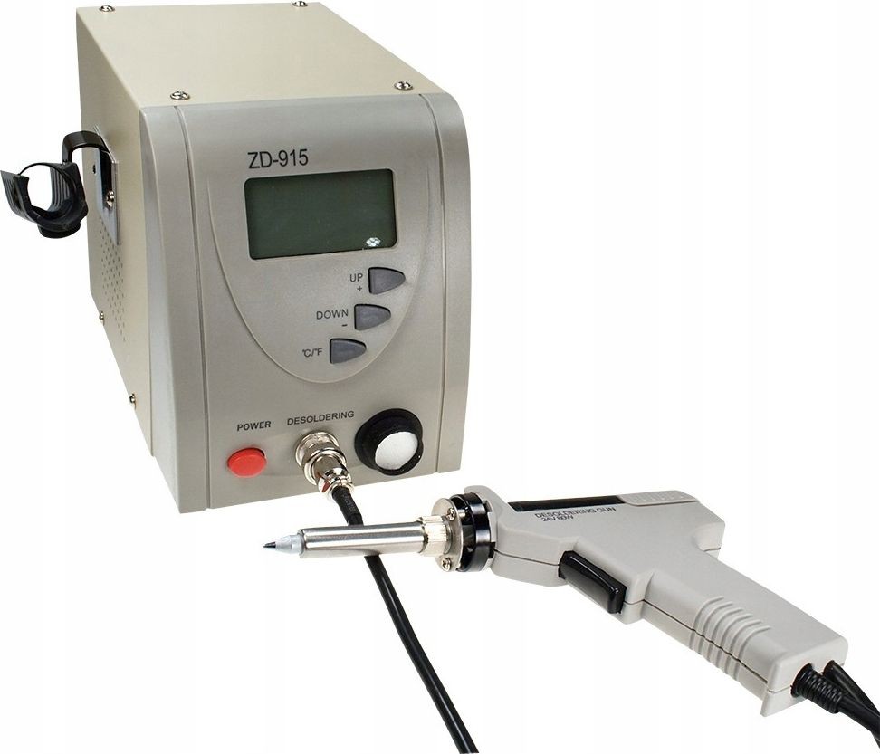 Lötstation zum Entfernen von elektronischen Bauteilen von Leiterplatten (PCB). Die Station verfügt über einen eingebauten Kompressor, der beim Betätigen des Pistolenabzugs startet und einen Unterdruck erzeugt. Im Vergleich zu herkömmlichen Absauggeräten ist sie komfortabler und ermöglicht ein schnelleres Arbeiten – sie erhitzt das Zinn selbst. Die Zentraleinheit ist mit einem großen und gut lesbaren LCD-Display mit Hintergrundbeleuchtung ausgestattet, das den eingestellten Temperaturwert sowie die am Lötspitzen gemessene (abgelesene) Temperatur anzeigt. Die Temperatur ist in Schritten von 1 °C im Bereich von 160 °C bis 480 °C einstellbar. Das leistungsstarke 90-W-Heizelement bewältigt viele schwierige Fälle.