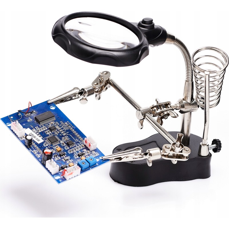 Dritte Hand mit Lupe, LED-Beleuchtung und Halterung für Lötkolben – ZD-126-2. Die Lupe mit Arbeitsbereichsbeleuchtung und der Halter für den Lötkolben erleichtern die Arbeit erheblich. Im Set enthalten ist eine verstellbare Lupe mit Vergrößerungslinse und integrierter LED-Beleuchtung. Dank der großen Vergrößerungslinse und der 2 x LED-Leuchten ist das Bild sehr klar und deutlich. Sie kann von Juwelieren, Numismatikern, Elektronik-Servicetechnikern, Uhrmachern usw. verwendet werden. Ein ideales Set für elektronische und elektrische Arbeiten.