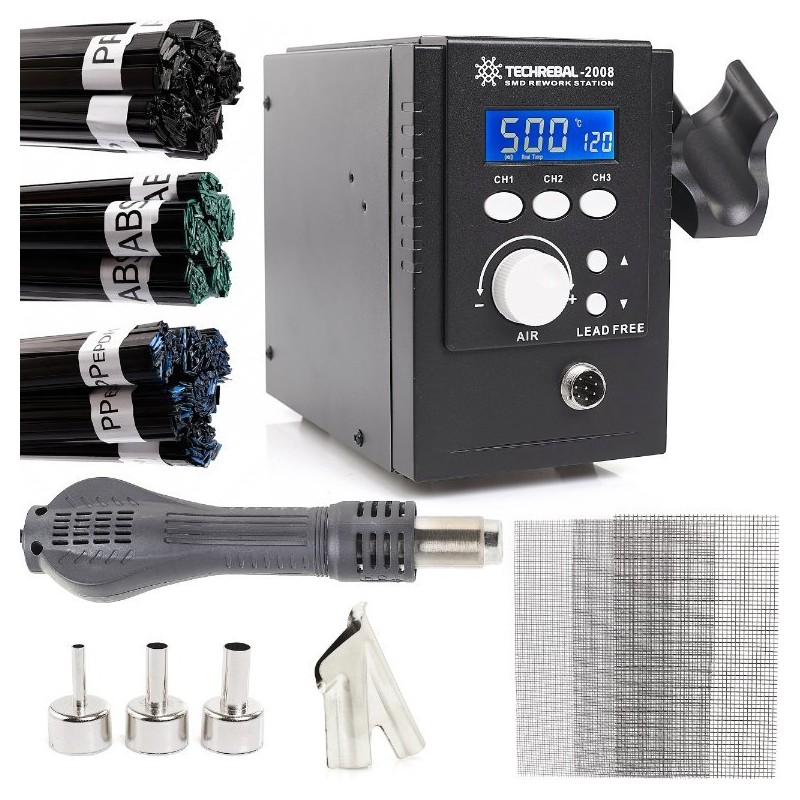 Löt-Set: Heißluft-Lötstation Techrebal 2008 + Kunststoffschweißgitter (hart, halbsteif, flexibel) + Klebstoffe für ABS, PP, PP/EPDM