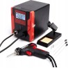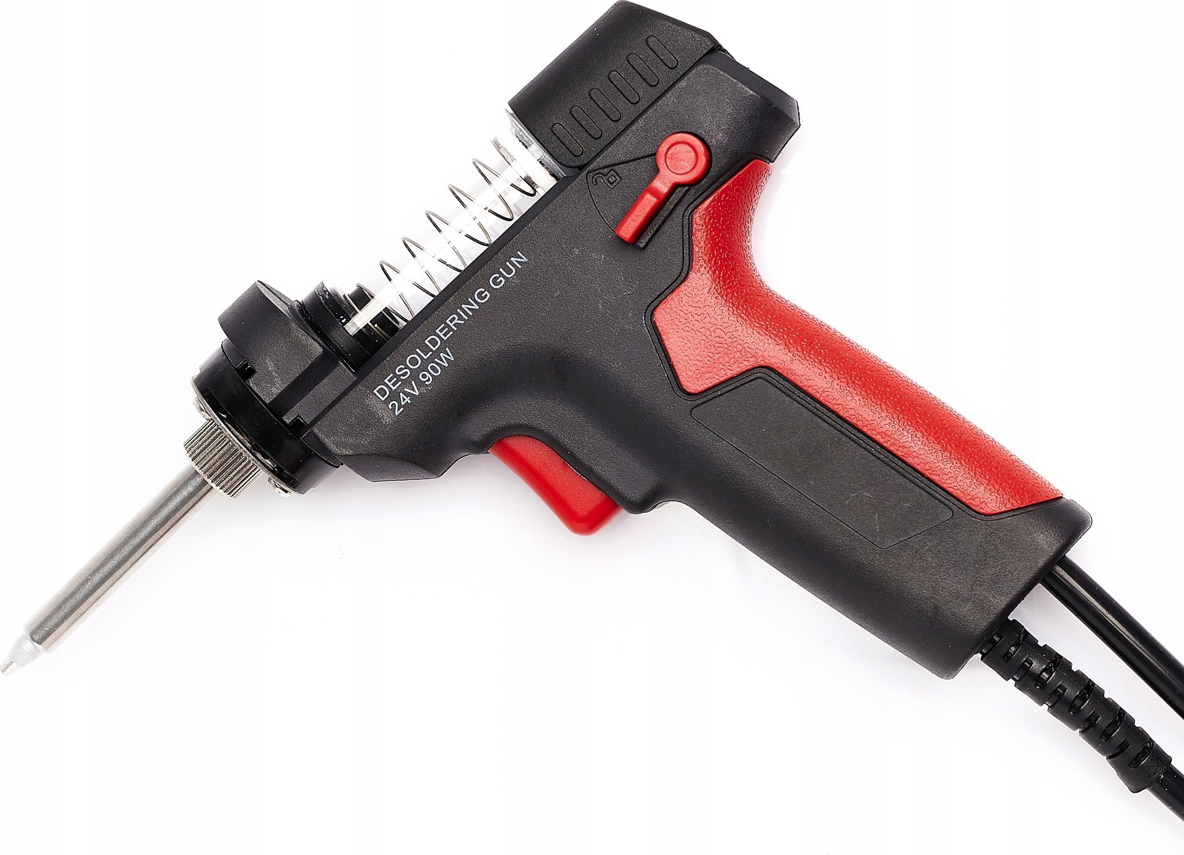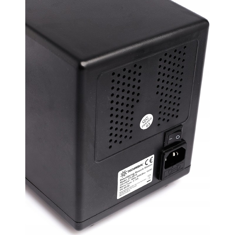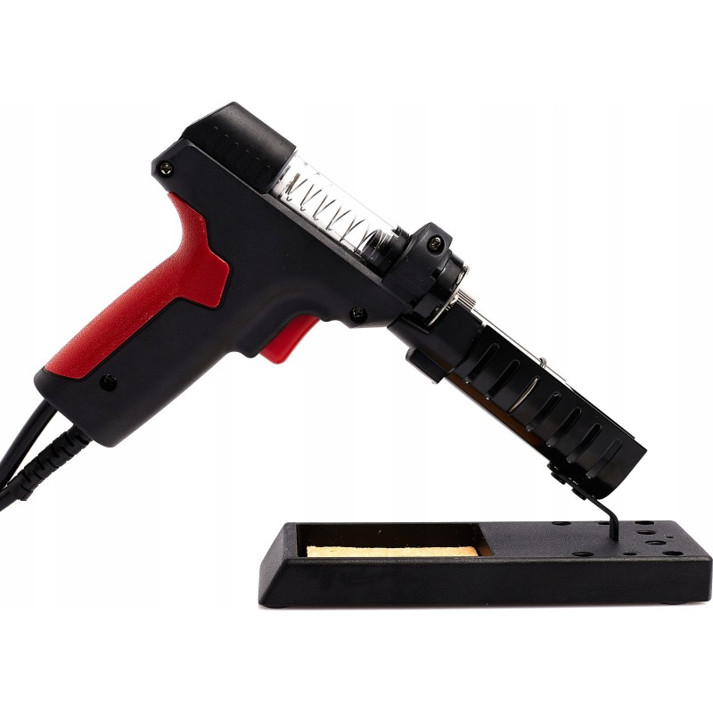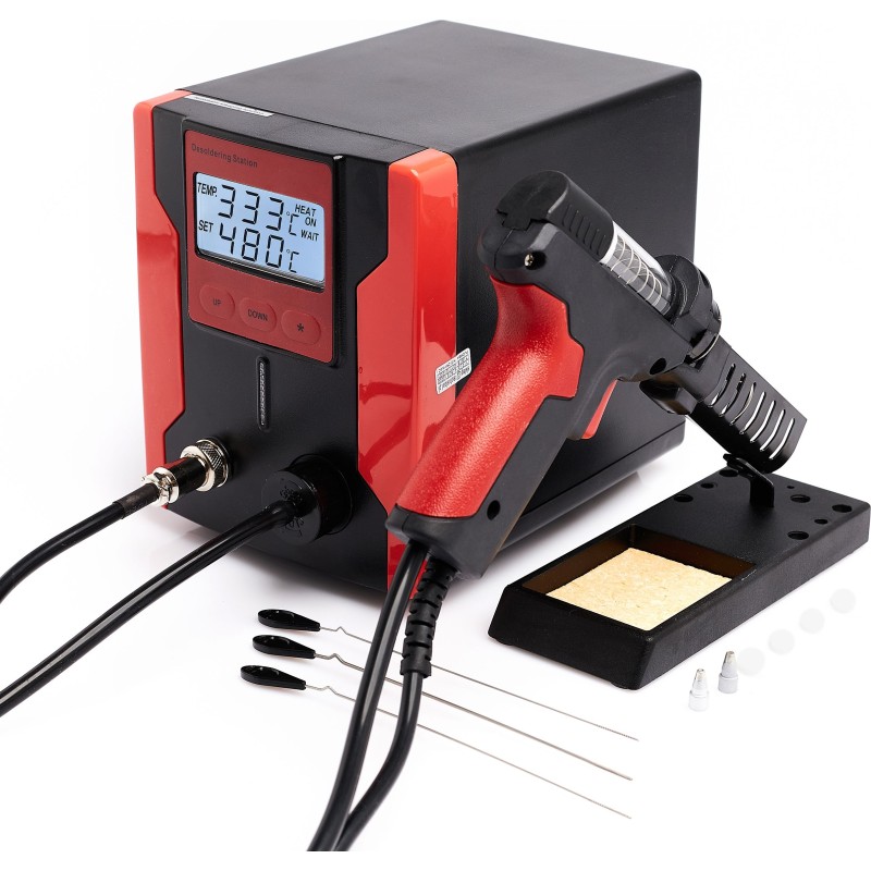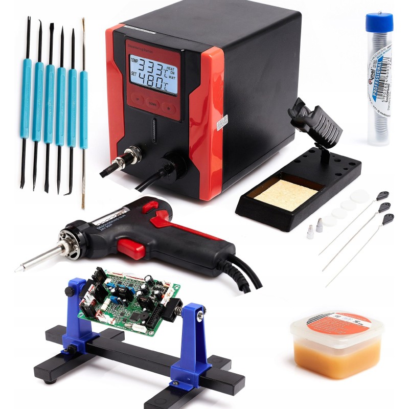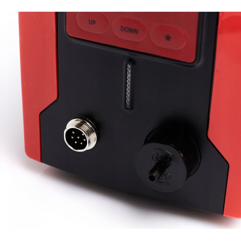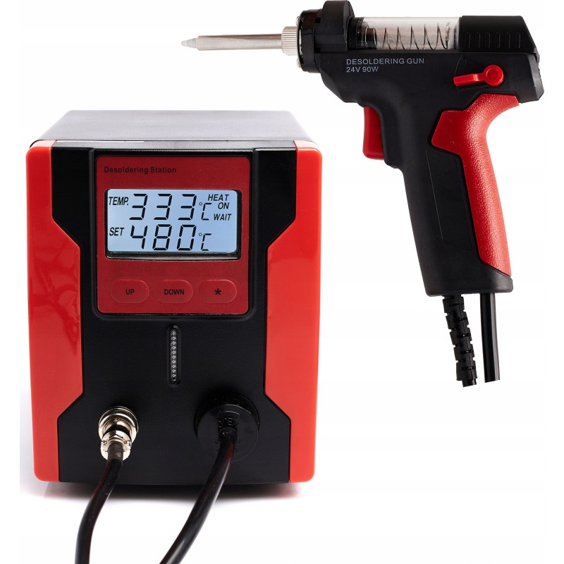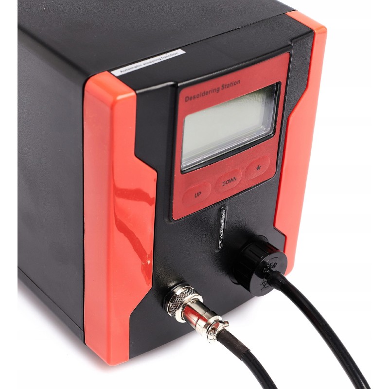 Lötstation zum Entfernen elektronischer Bauteile von Leiterplatten (PCB). Die Station verfügt über einen eingebauten Kompressor, der beim Betätigen des Pistolenabzugs startet und einen Unterdruck erzeugt. Im Vergleich zu herkömmlichen Absauggeräten ist sie komfortabler und ermöglicht ein schnelleres Arbeiten – sie erhitzt das Zinn selbst. Die Zentraleinheit ist mit einem großen und gut lesbaren LCD-Display mit Hintergrundbeleuchtung ausgestattet, das sowohl die eingestellte Temperatur als auch die an der Lötspitze gemessene (abgelesene) Temperatur anzeigt. Die Temperatur ist in Schritten von 1 °C im Bereich von 160 °C bis 480 °C einstellbar. Die Station verfügt über eine Sleep-Funktion, die die Lebensdauer des Heizelements verlängert: Wenn die Lötpistole 15 Minuten lang nicht benutzt wird, kühlt der Kolben automatisch auf 200 °C ab; sobald der Kolben angehoben wird, erfolgt eine erneute Aufheizung auf die eingestellte Temperatur. Das leistungsstarke 90-W-Heizelement bewältigt viele schwierige Fälle. Die Station ist aus hochwertigen Materialien gefertigt und sieht in ihrer roten Farbe phänomenal aus.