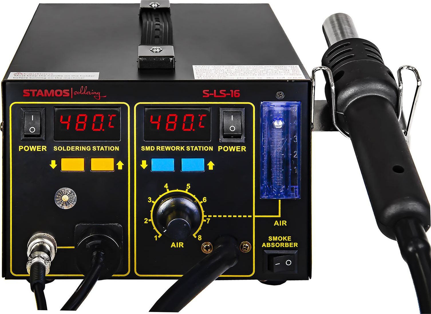 Die Heißluftpistole (die auch als Kunststoffschweißgerät verwendet wird) verfügt über eine Regelung der Luftblasskraft sowie eine Drehzahlanzeige, die die aktuelle Blasgeschwindigkeit anzeigt. Das Modul der Heißluftpistole kühlt sich automatisch ab, was die Lebensdauer ihrer Bauteile verlängert. Die einzelnen Geräte der Stamos Soldering-Station arbeiten unabhängig voneinander. Dadurch können Arbeiten mit allen Komponenten gleichzeitig oder auch mit jeder einzelnen Komponente durchgeführt werden.